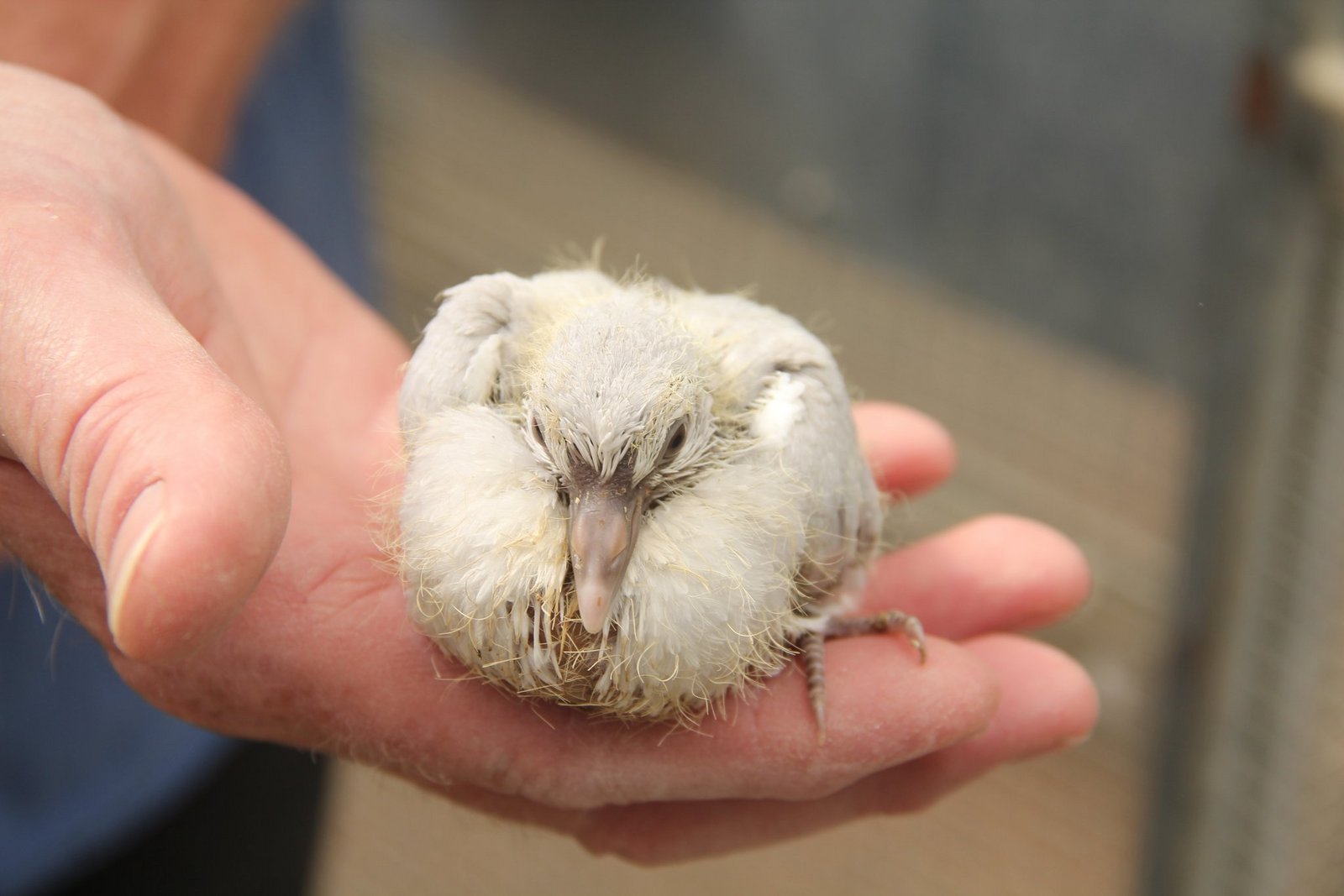 Ein Lachtaubenpaar züchtet auch in einem Käfig und zieht bereitwillig Junge auf. Als Nest sollte ein Korb zur Verfügung gestellt werden. «Es ist wichtig, dass er gross genug ist, sonst klappt es nicht.» Leutwiler verwendet halbierte Holznistkästen, in welche die Tauben ein loses Nest aus wenigen Zweigen bauen. Als Nestunterlage gibt er ihnen Heu. «Ich forme bereits eine Nestmulde vor», sagt er. Lachtauben legen immer zwei Eier, die Brutzeit dauert 18 bis 21 Tage und die Nestlingszeit 21 Tage. Drei Wochen nach dem Ausfliegen sind die Jungen selbstständig. Sie haben die Äuglein von Anfang an offen und sollten zwischen fünf und sieben Tagen beringt werden. Pierre-Alain Leutwiler lässt nicht mehr als zwei Jahresbruten zu, um die Vögel nicht zu sehr auszulaugen.