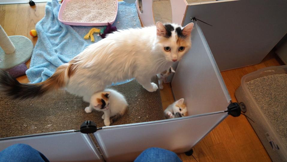Vorsichtig öffnet die junge Frau die Türe zum ersten Zimmer, wo sich die zweijährige Nyks über Abwechslung im Baby-Alltag zu freuen scheint. Drei Junge hat sie zur Welt gebracht – und dabei ganz alleine alles richtig gemacht. Falls nicht, hätte Schlachter ein motiviertes Team aus Züchter-Freundinnen zur Seite gestanden, welches sie bereits im Vorfeld mit Rat und Tat unterstützte. Eine wichtige Rolle spielt aber nicht zuletzt ihre «Türkisch-Van-Patin» aus Deutschland, welche Schlachter über Facebook kennengelernt hat und die ihr nun bei rassespezifischen Fragen weiterhilft.