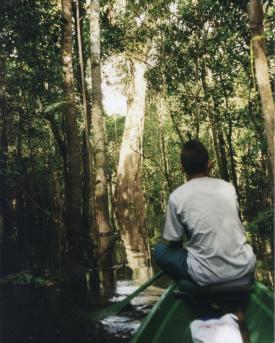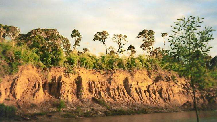 Der Tambopata-Fluss entwässert in den Madre de Dios, der in den Rio Madeira fliesst und dieser wiederum in den Amazonas. Der Oberlauf des Amazonasstroms in Brasilien heisst Rio Solimões. Bei Tefé im brasilianischen Bundesstaat Amazonas stehen die Wassermassen schier. Der Varzea-Wald, ein Überschwemmungswald, ist auf die Fluten ausgerichtet, die ihn jährlich während der Regenzeit erreichen, sodass das Wasser seinen Höchststand erreicht. Im April findet das Leben nur noch in den Baumkronen statt, so hoch steht das schwarze Wasser.