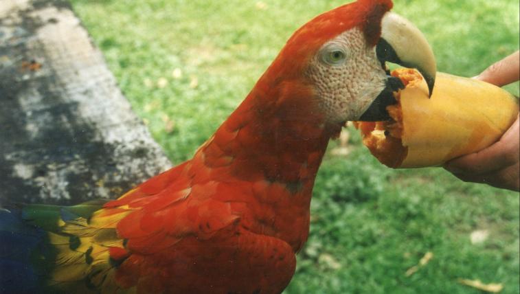 Tatsächlich sitzt zuoberst auf einem Stamm ein Gelbbrustara mit schmutzig gelbem Brustgefieder – ein Zeichen, dass der Vogel immer wieder in den oben offenen Palmenstamm klettert, um sein Junges zu versorgen. Vermutlich ist es das Weibchen, und das Männchen hat gegenüber in der Palmenkrone gewarnt. Der Stamm könne drei, vier Meter tief sein, das Junge würde dann mühsam emporklettern, wenn es nach drei Monaten so weit sei, ausfliegen zu können.