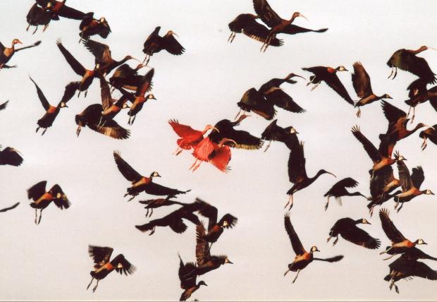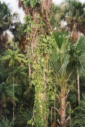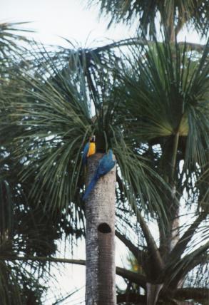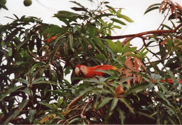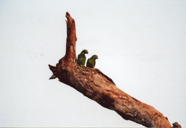 Als es einen Abhang hinuntergeht, wird die Luft wieder stickig. Plötzlich leises Grunzen, Edwin erstarrt. Unvermittelt prescht eine Rotte Pekaris davon. Die Gummistiefel sinken mit schmatzendem Geräusch im Schlamm und Schlick ein. Zu beiden Seiten wachsen Palmen, deren Stämme im Sumpf oder teilweise auch ganz im Wasser stehen. Ein rauer, kreischender Schrei erschreckt die Fremden. Ein Gelbbrustara ist in eine Palmenkrone geflogen und äugt auf die Menschengruppe herab. Im dünnen Stamm einer abgestorbenen Palme wächst sein Junges heran. Edwin bleibt stehen, klatscht sich eine Mücke aus dem Gesicht, sieht zu Boden und sagt: «Hier, frische Tapir-Spuren.»