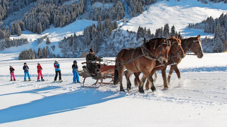 Sonnenstrahlen glitzern auf dem Neuschnee, etwas weiter oben quietscht eine Komposition der Matterhorn-Gotthardbahn vom Oberalppass kommend über ein Viadukt talabwärts, die Kantonsstrasse unten ist schneebedeckt und die dunklen Tannen an den Berghängen tragen dicke Schneeschichten wie Watte. Die Glöcklein um den Hals der Pferde klingeln noch intensiver, als die Tiere trabend das letzte Stück in Angriff nehmen. Oben angekommen, entspannen sich die Gesichter der Kinder, beim Heruntersausen strahlen sie, während die drei Wallache über einen schneebedeckten Weg oberhalb der Piste gehen und langsam wieder abwärtstrotten.
