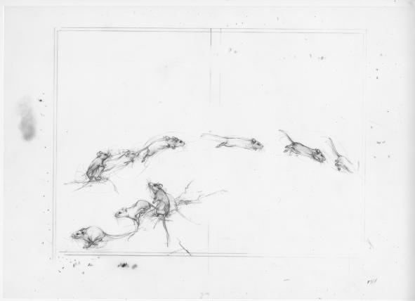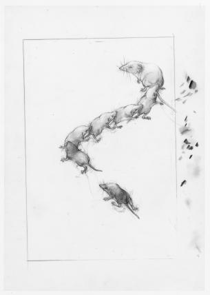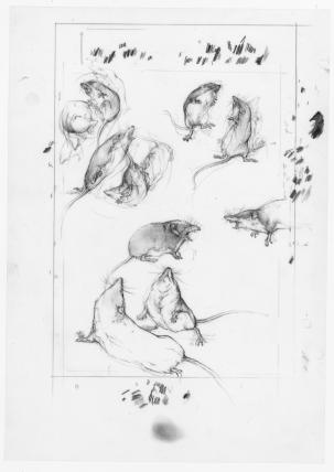 Mit dem Ansatz der Bewegtheit stellen die Zeichnungen nun auch den wohl wichtigsten Teil eines Mäuselebens ins Zentrum. Um ihren kleinen Organismus am Laufen zu behalten, müssen die Tiere nämlich immerzu fressen und sich bewegen – sei es nun die Schneemaus oder eine ihrer Verwandten.