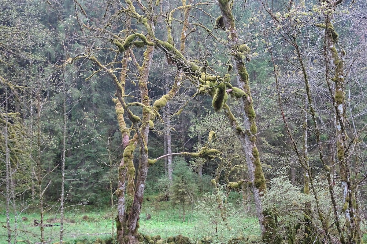 Das Flachmoor Les Goudebas hat nationale Bedeutung. Es liegt am Ende einer verträumten Schlucht. Die knorrigen Äste der Bäume sind mit dicken Moosschichten besetzt. Ein Resultat von häufigem Nebel. Auf der gegenüberliegenden Seite der Sumpfwiese liegt die Grenze zu Frankreich.