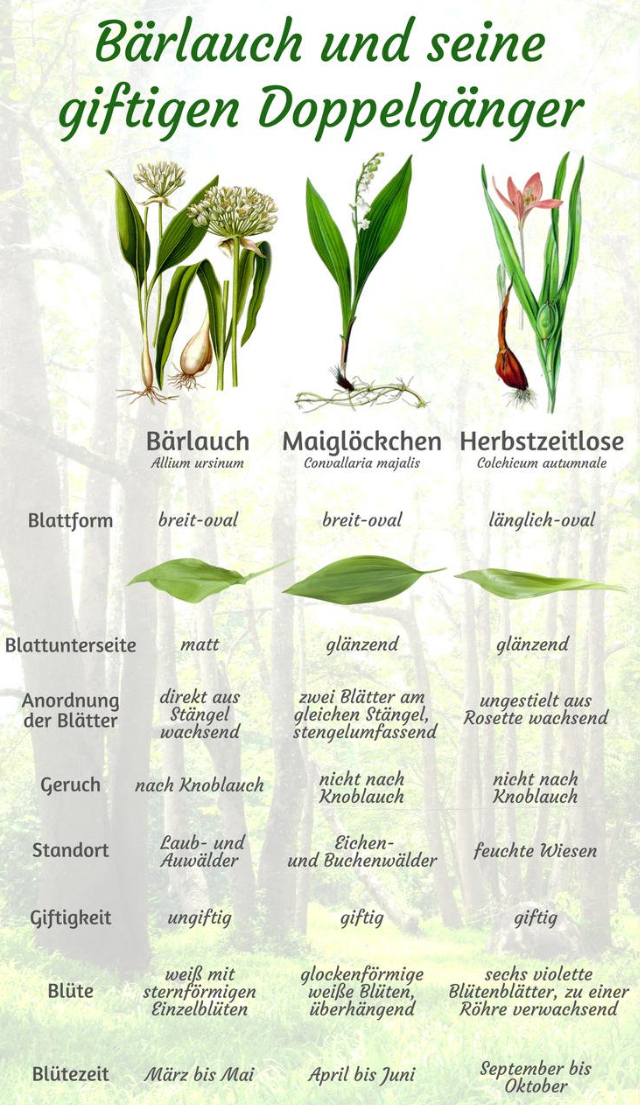 Bekanntermassen gibt es einige Pflanzen, mit denen Bärlauch verwechselt werden kann. Einige von ihnen sind giftig, daher sollte man sich beim Pflücken absolut sicher sein, dass es sich bei den Blättern wirklich um Bärlauch handelt. Diese erkennt man nebst am Geruch daran, dass sie einen Stiel haben, jeweils zwei an einer Pflanze wachsen und einzeln aus dem Boden ragen. Im Zweifelsfall sollte man die Pflanze lieber stehen lassen.