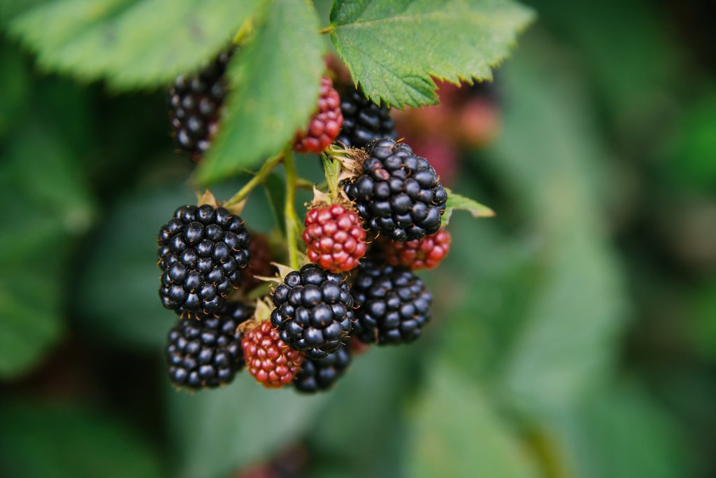 Die dunkelvioletten Beeren sind ein intensiver Gaumenschmaus mit reichlich Vitamin C. Brombeeren sind mit Himbeeren verwandt und haben noch ausgeprägtere Dornen. Deswegen muss man beim Pflücken etwas vorsichtig sein.