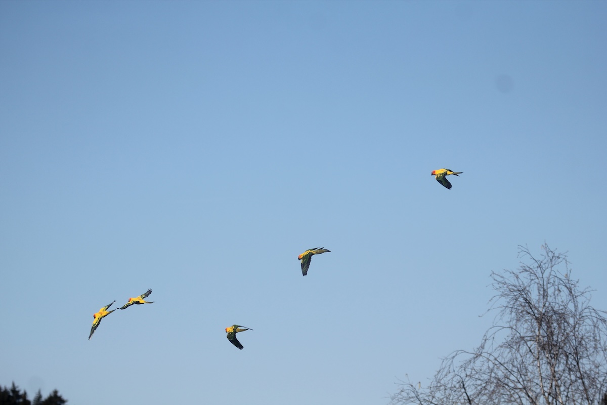Die beiden am blauen Himmel fliegenden Gelbbrustaras gleichen mit ihren langen Schwänzen bunten Drachen. Ein Schwarm Sonnensittiche flitzt mit und scheint sie zu eskortieren. Grünzügelpapageien flattern aus dem Grün eines Busches. Solche Szenerien bieten sich nur in abgeschiedenen Gebieten Südamerikas – oder im sankt-gallischen Gossau. Das Flugtraining im Walter Zoo ist einzigartig in der Schweiz. Dort können nicht nur Papageien, sondern auch St. Galler Flügeltauben, ein Truthahngeier und ein Wüstenbussard frei fliegend bewundert werden.
