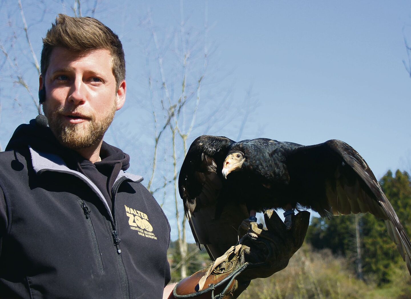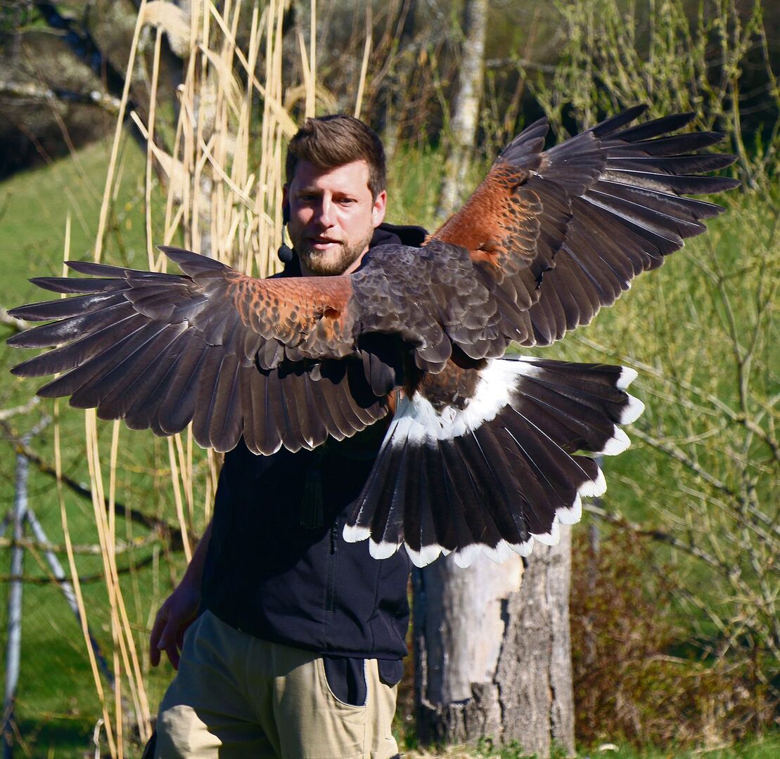 Normalerweise werden Vögel in Volieren gehalten. Im Walter Zoo fliegen sie auch frei am Himmel und entfalten ihre Flugkünste. So gleitet plötzlich ein Schatten über die Köpfe, ein leichter Windzug, schon sitzt der grosse Greifvogel auf Dominic Kasts ausgestrecktem Arm. «Das ist Alanis, unser Wüstenbussard», sagt der Revierleiter Vögel des Walter Zoos.