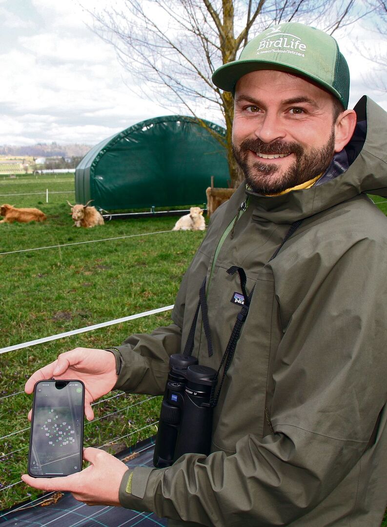 Ansonsten nichts – meint man bei oberflächlicher Betrachtung der nicht gerade abwechslungsreichen Landschaft. Lucas Lombardo aber zaubert der Blick durch sein Spektiv ein Lächeln aufs Gesicht. «Hier, ein Nest», raunt er. Tatsächlich! Im Fernrohr zeigen sich wenige braune Halme, die eine Kuhle umranden. Darin sitzt ein kecker, lachmöwengrosser Vogel mit schwarzer Haube. Ein Kiebitz! «Hier sind weitere», kommentiert der Ornithologe seine Suche und fügt an: «Bei heftigem Wind fliegen sie nicht.» Lucas Lombardo sucht die Fläche systematisch mit dem Fernrohr ab, vergleicht die Neststandorte mit den elektronischen Aufzeichnungen auf seinem Mobiltelefon. «Es sind jetzt 20…