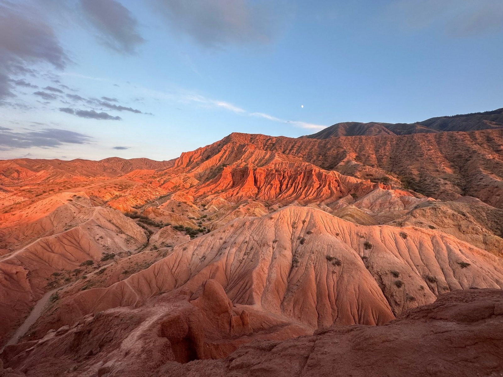 Als Gott die Welt schuf und das Land an die Völker verteilte, kamen die Kirgisen zu spät. Doch er hatte Erbarmen und gab ihnen einen Teil seines Paradieses ab. So zumindest die etwas selbstironische Legende. Doch bei der Fahrt auf 1600 Meter über Meer rund um den zweitgrössten Bergsee der Welt, dem Yssykköl-See, wird klar, dass das nicht von ungefähr kommt: Das Wasser funkelt in der Sonne, dahinter wechselnde Berglandschaften. Liebliche Lehmberge, rote Sandsteinfelsen und weisse Schneeberge. Der Yssykköl-See ist eingekesselt zwischen zwei Bergketten – nördlich der Kungej-Alatau und südlich der Terskej-Alatau mit Bergspitzen, die viereinhalbtausend Meter in die Höhe ragen.