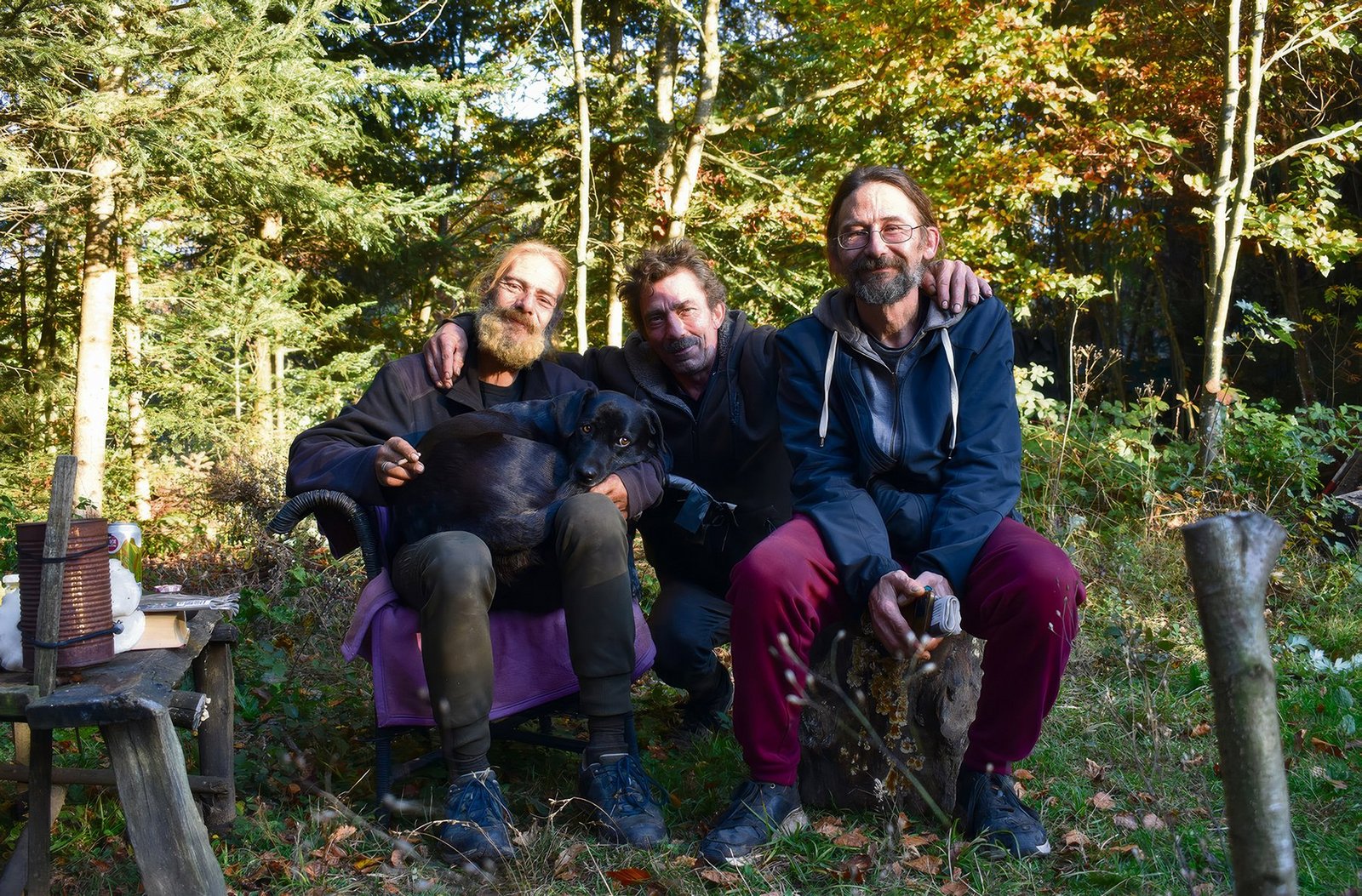 Es ist der letzte Montag im Oktober – strahlend blauer Himmel und T-Shirt-Wetter an der Sonne; der Wald herbstlich eingefärbt. Chrütli geht zielsicher durch den Wald. Immer an seiner Seite ist seine Hündin Manali. «Den Platz, wo wir jetzt leben, habe ich bereits als Kind gekannt», erzählt er. Schliesslich ist er unweit davon in Bern-West aufgewachsen. Leise Rave-Musik lässt erkennen, dass das Ziel nicht fern ist. Und tatsächlich dauert es vom Stadtrand her kaum zehn Minuten, um die Lichtung zu erreichen, auf der die Waldmenschen leben. Jeder von ihnen schläft in einem rudimentären, selbst gebauten Unterstand mit integrierter Feuerstelle; daneben ein Gemüsegarten, eine weitere Feuerstelle «für den Sommer» und ein Tisch mit einer Bank, wo Röfe bereits sitzt, Musik hört und raucht. Der 48-Jährige war vor seinem Ausstieg Bauer; hat nun seinen zweiten Winter im Wald vor sich. Chrütli gesellt sich zu ihm – doch nicht, ohne vorher einen Lungenseitling aus dem Boden zu ziehen. «Toll, das gibt ein leckeres Znacht!» Pilze zu sammeln sei für ihn wie Meditation, erzählt der 53-Jährige. «Für mich ist das die beste Auszeit des Tages, wenn ich mir einige Stunden Zeit nehme, mit den Hunden querfeldein gehe und zusehe, was ich finde.» Wenn dabei auch Abfall von anderen Waldbesuchenden ist, wird dieser genauso mitgenommen wie die Pilze. Denn: «Trage Sorge zur Natur und hinterlasse alles so, wie du es vorgefunden hast», lautet eine der wenigen Regeln, die unter den Waldmenschen gelten.