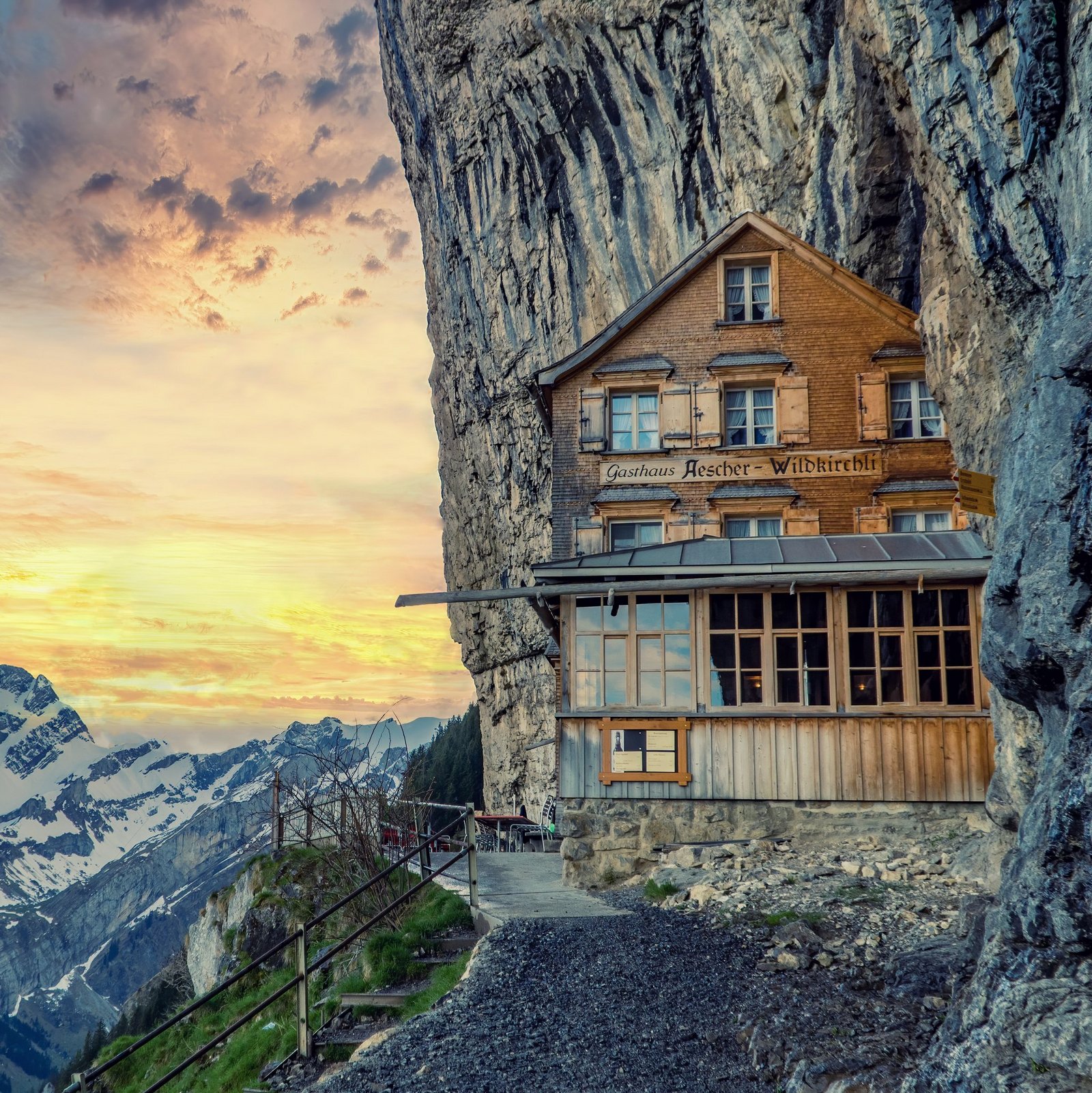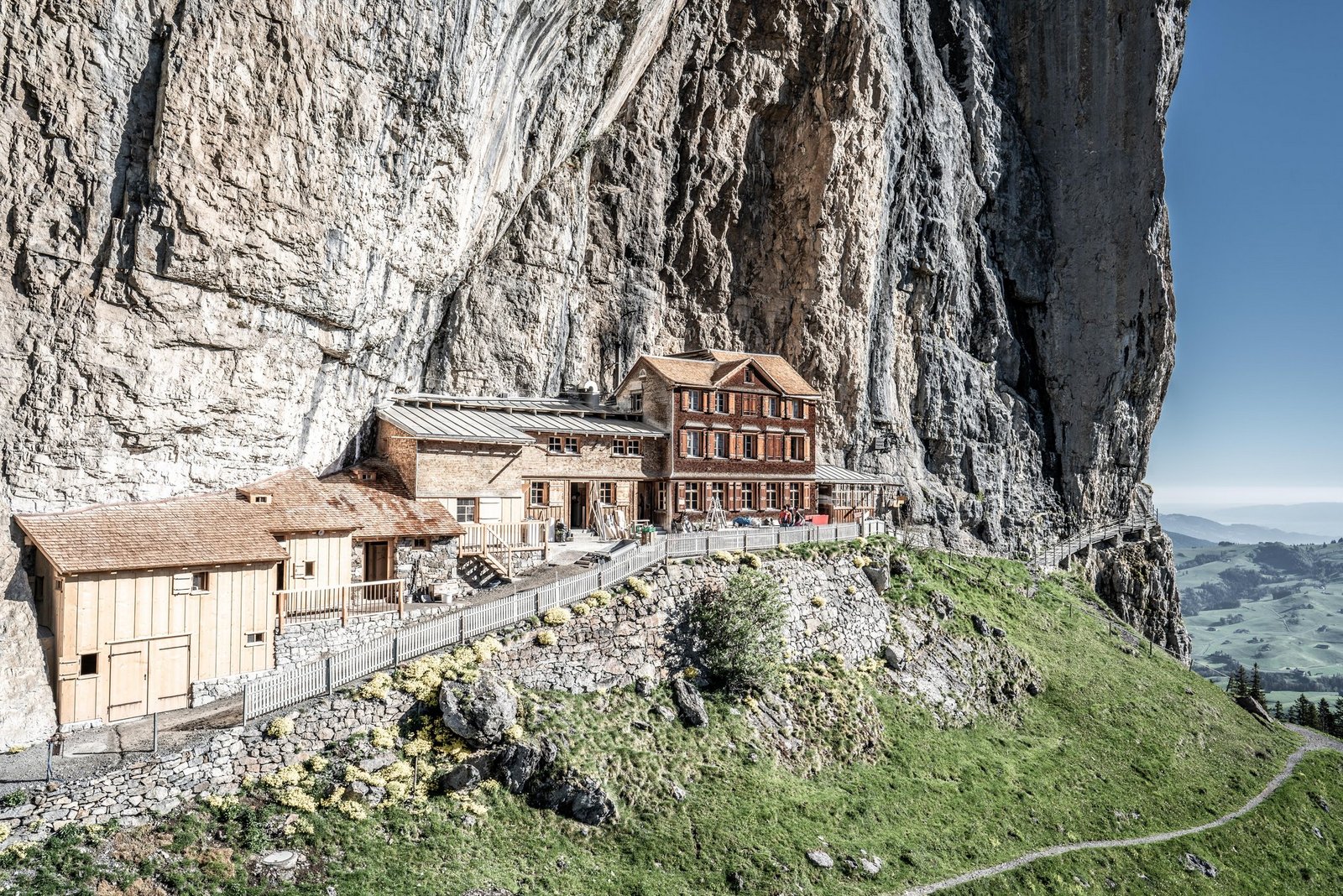 Seit 1860 öffnet das Gasthaus Aescher-Wildkirchli seine Türen für hungrige Gäste. Das Bergrestaurant klebt an der Fluh und gehört zu den ältesten der Schweiz. Seit es die Titelseite des National Geographic Magazins zu den schönsten Orten der Welt zierte, ist das Berggasthaus Aescher in Appenzell Innerrhoden weltbekannt. Die saisonale Küche bleibt trotzdem lokal und bodenständig. Zu erreichen ist das Restaurant von Wasserauen aus mit der Ebenalpbahn. Danach hat man nur noch 15 Minuten zu Fuß durch die Wildkirchlihöhlen. Wanderer können auch von Wasserauen aus zweieinhalb Stunden zum Aescher wandern.