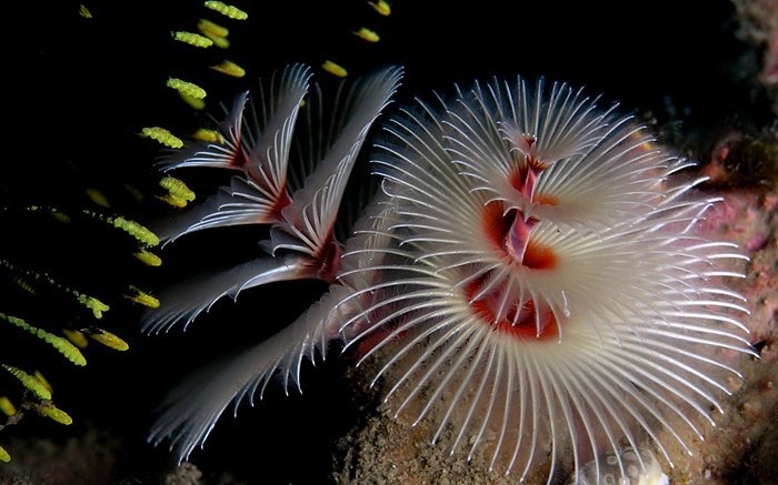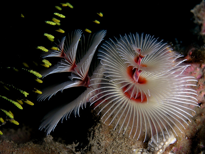 Mit den Tentakeln fangen die Würmer kleine Nahrungspartikel ein und transportieren sie Richtung Mund. Ausserdem dienen sie als Kiemen auch der Atmung. Spiralröhrenwürmer leben in selbstgebauten Kalkröhren, in die sie sich bei Gefahr blitzschnell zurückziehen können. Diese Röhren findet man oft zwischen Steinkorallen. Ihr bis zu 40 Jahre dauerndes Leben verbringen die Würmer sesshaft in den Röhren. Von ihrer eigenen Farbenpracht erfahren die Tiere nichts, denn sie besitzen keine Augen.