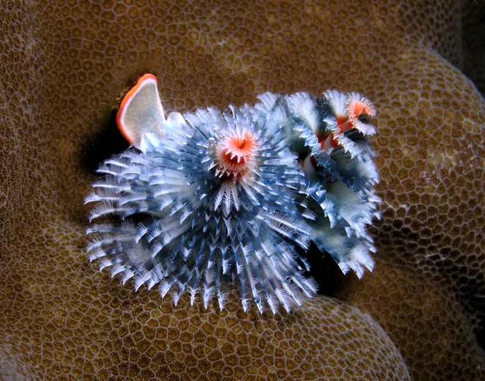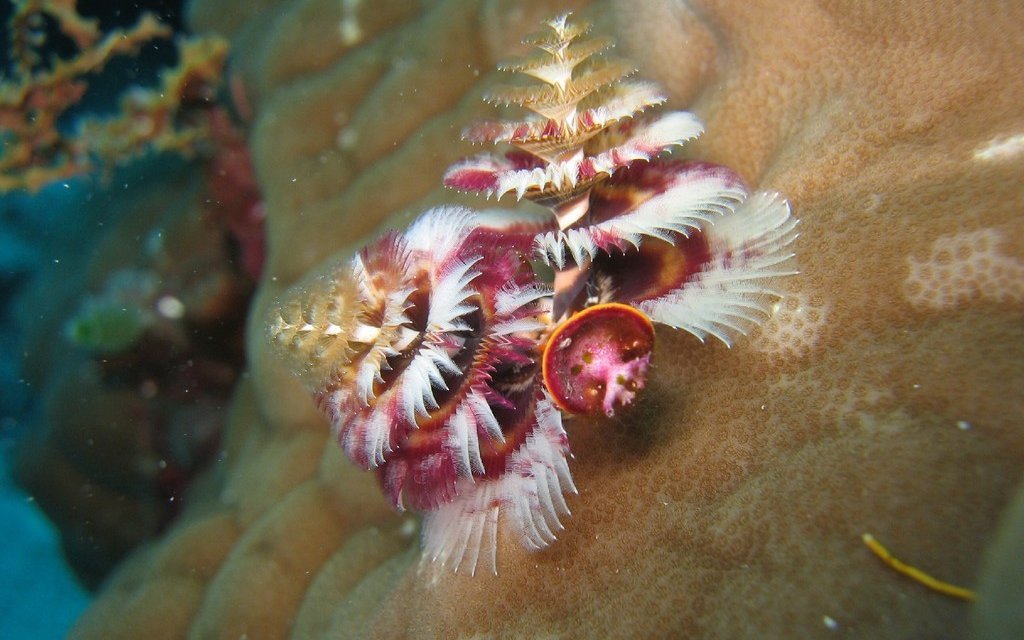 Der Weihnachtsbaumwurm (Spirobranchus giganteus) gehört zur Familie der Kalkröhrenwürmer und lebt in flachen warmen Meeren bei einer Wassertemperatur zwischen 24 und 26 Grad. Seinen deutschen Namen verdankt der Weihnachtsbaumwurm seinem auffälligen Aussehen. Um seinen bis zu 10 Zentimeter langen Körper sind zwei konische, spiralförmig gewundene Tentakelkronen von bis zu 2,5 Zentimeter Länge gewunden, die in bunten Farben erscheinen. Bekannt sind gelbe, orange, rote, pinke, blaue, weisse und braune Weihnachtsbaumwürmer.