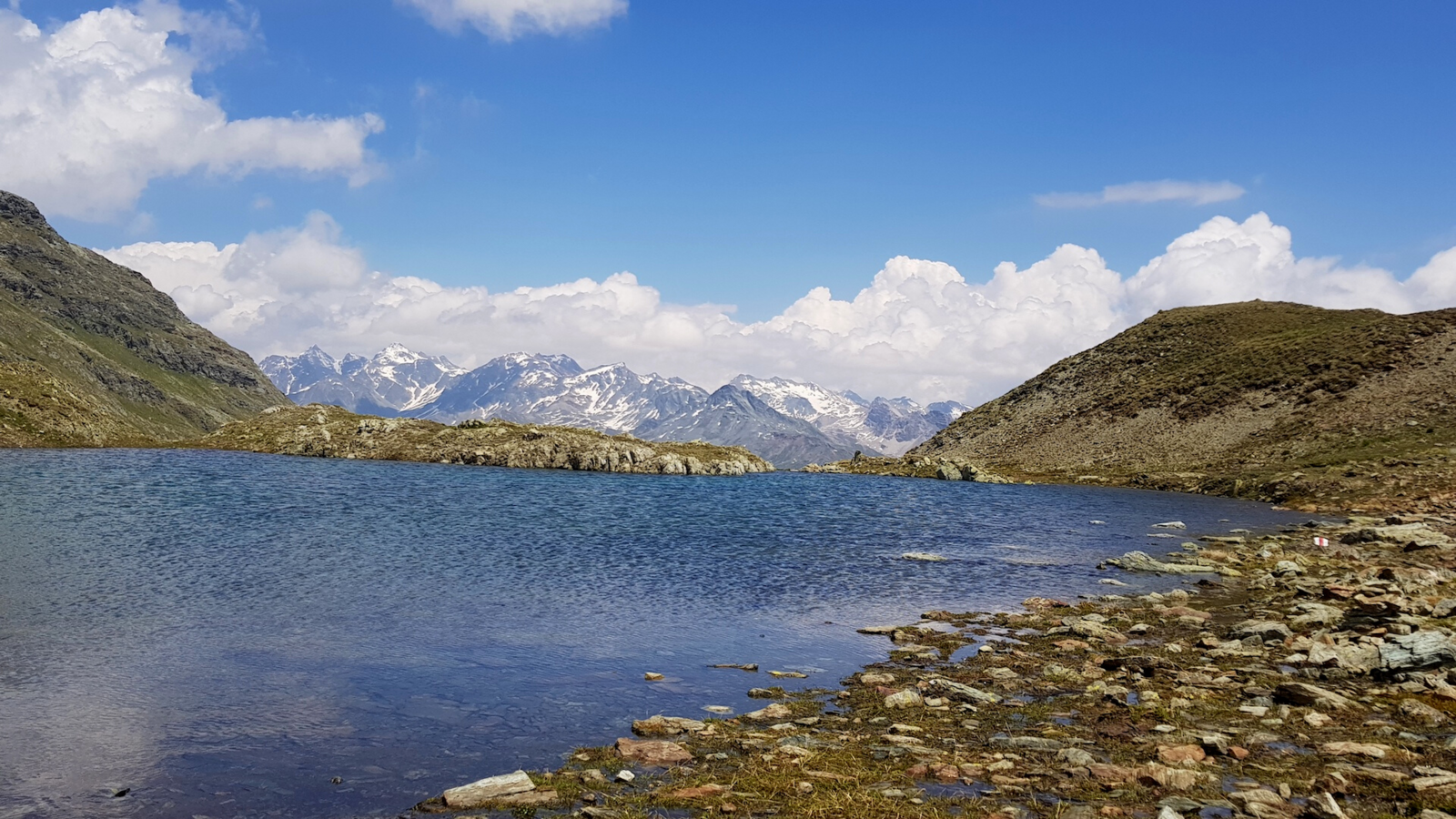 - Blau-Weisse Markierungen signalisieren Alpinwanderungen. Diese führen teilweise über Schneefelder, Gletscher oder Geröllhalden. Auch Felsen mit kurzen Klettersteigen können auf dem Weg liegen. Diese sind teilweise weglos und es kann nicht davon ausgegangen werden, dass es bauliche Vorkehrungen, wie Stangen oder Ringe gibt. Neben den Basics gehören auch Kompass, Seil, Pickel und Steigeisen in den Rucksack.