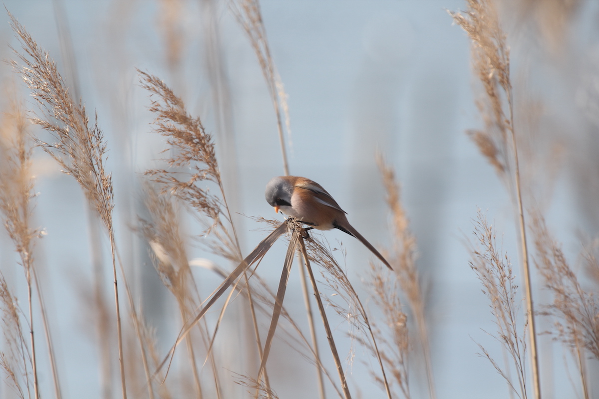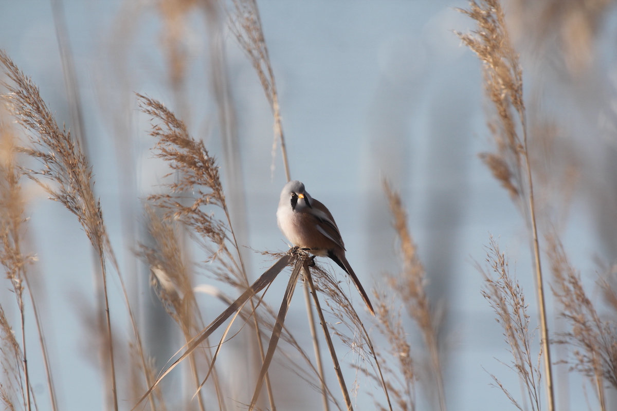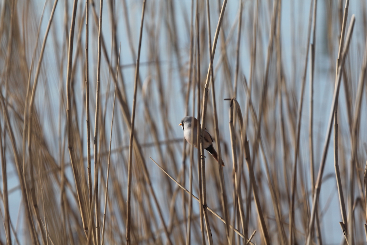Die Bartmeise ist eine wundervolle Erscheinung! Weibchen scheinen zu fehlen. Es sind vier Männchen, die einander, immer nasal rufend, nachfliegen, tief im Schilf verschwinden und sich dann flatternd am Halm hocharbeiten. Das ist der Moment für den Vogelbeobachter. Mehrheitlich sitzen sie in der mittleren und unteren Schilfschicht, wo sie ganz aus dem Blickfeld verschwinden.