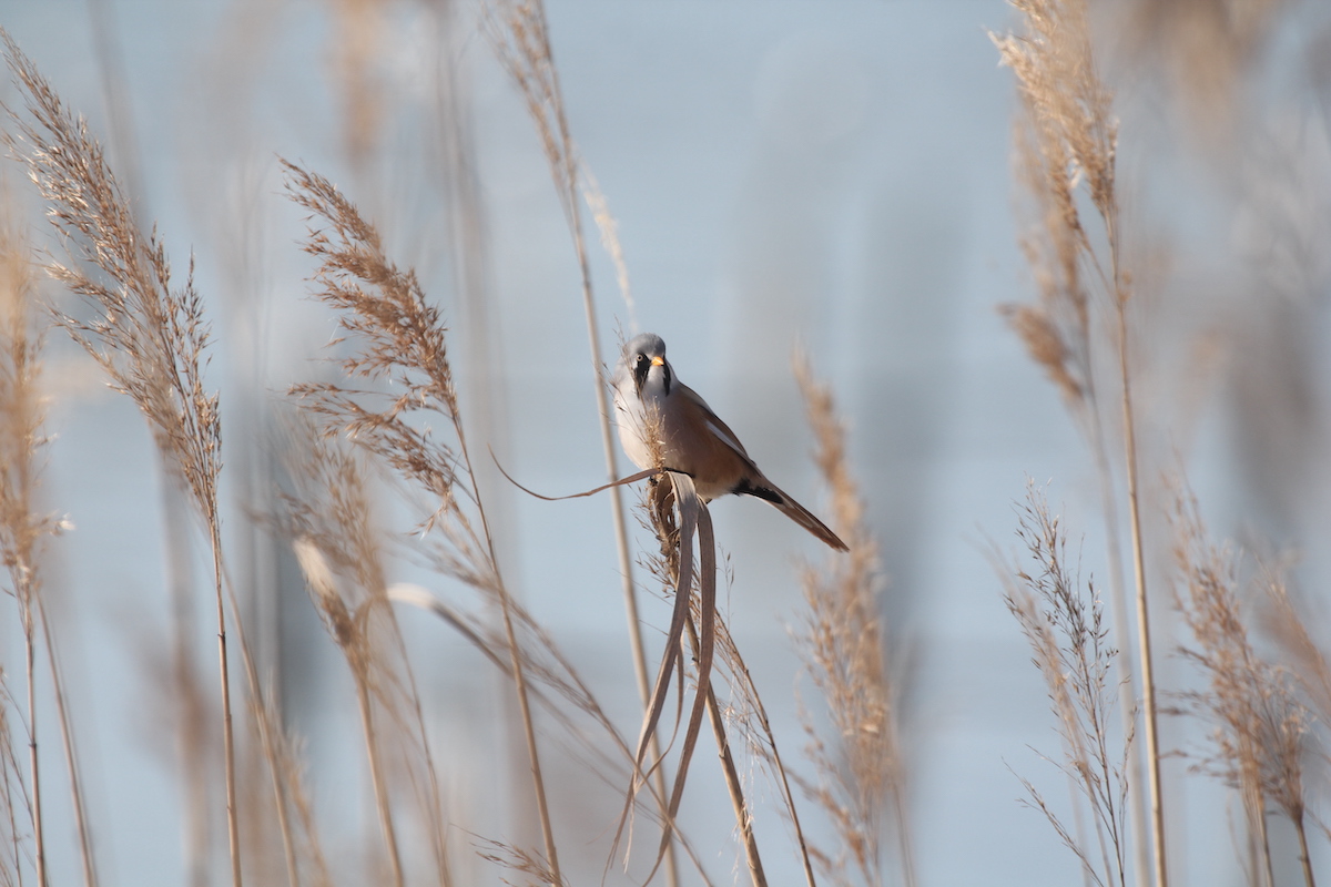 Da der Schilfgürtel schmal ist, ergeben sich Beobachtungsmöglichkeiten. Im Morgenlicht krallt sich ein Männchen zuoberst an einen Schilfhalm und nestelt an den Samen. Ein Kumpan flattert weiter hinten. Nun zeigen sich die pechschwarzen Bärte im goldenen Sonnenlicht, der gelbliche Schnabel leuchtet, das bräunliche Bauchgefieder wirkt seidig.