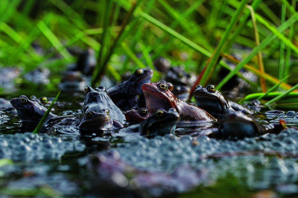 Doch von Weitem ist ein Sirren zu hören. Die Eisfläche auf dem Teich scheint plötzlich zu leben, das wenige offene Wasser brodelt, als würde es kochen. Hunderte von Grasfröschen hüpfen über die Eisfläche und flüchten vor dem sich nähernden Menschen ins offene, eiskalte Wasser. Dort schwimmen so viele, dass es unmöglich für sie ist, sich überhaupt zu verstecken. Manche scheinen sich mit ausgestreckten Beinen im eiskalten Wasser zu räkeln wie ein hochsommerlicher Schwimmer in einem See. Wieder andere quaken im seichten Wasser zwischen grossen, gallertartigen Laichballen, die aussehen wie Blumenkohl.