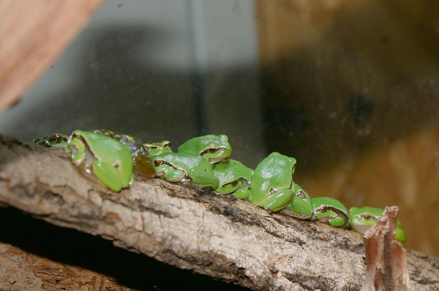 Zuoberst auf einem Ast unter einer Lampe mit ultraviolettem Licht sitzen grüne Laubfrösche aneinandergereiht, teilweise sogar aufeinander. Ihre Haut wirkt wie aus Plastik. «Der Laubfrosch braucht Sonne. Er klettert im Sommer auf Bäume in zehn bis zwanzig Metern Höhe und jagt dort Insekten», sagt der Veterinär und Kurator des Natur- und Tierparks Goldau. Diese Institution hat sich um den Laubfrosch verdient gemacht und hat es erreicht, dass er ab Mai wie einst bis in die Jahre um 1970 wieder am Lauerzersee ruft. Der See liegt in der Nähe des Natur- und Tierparks.