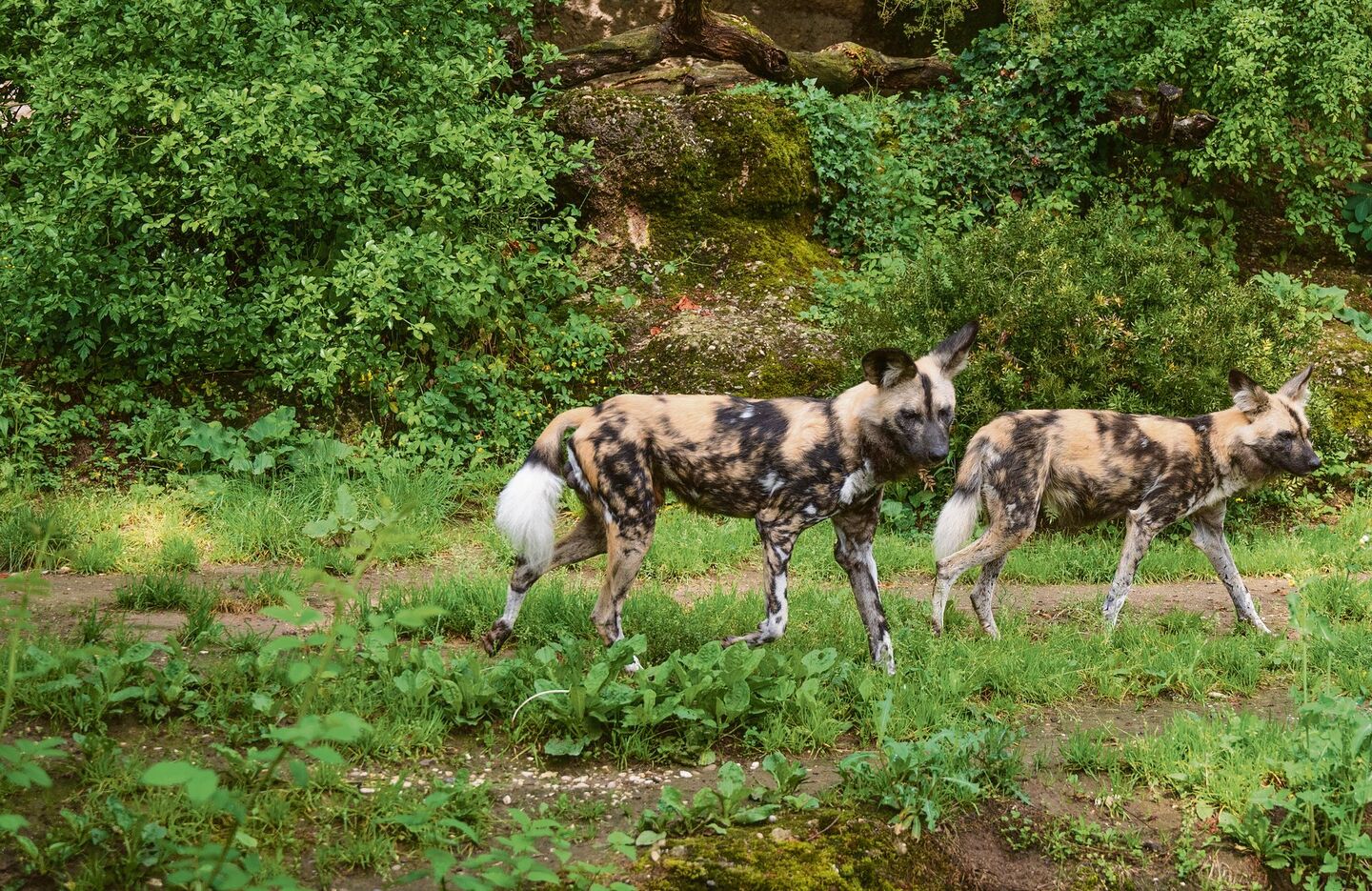 Die beiden Afrikanischen Wildhunde oder Hyänenhunde liegen am späten Vormittag anfangs Juni 2025 einträchtig in einer Felsenhöhle, als ob sie schon lange zusammengehörten. Sie sind müde vom vormittäglichen Spiel. Da wälzten und fläzten sie sich auf dem Boden und rauften miteinander. Viel Hoffnung liegt auf ihnen. Sie sollen den Grundstock für ein Basler Rudel bilden.