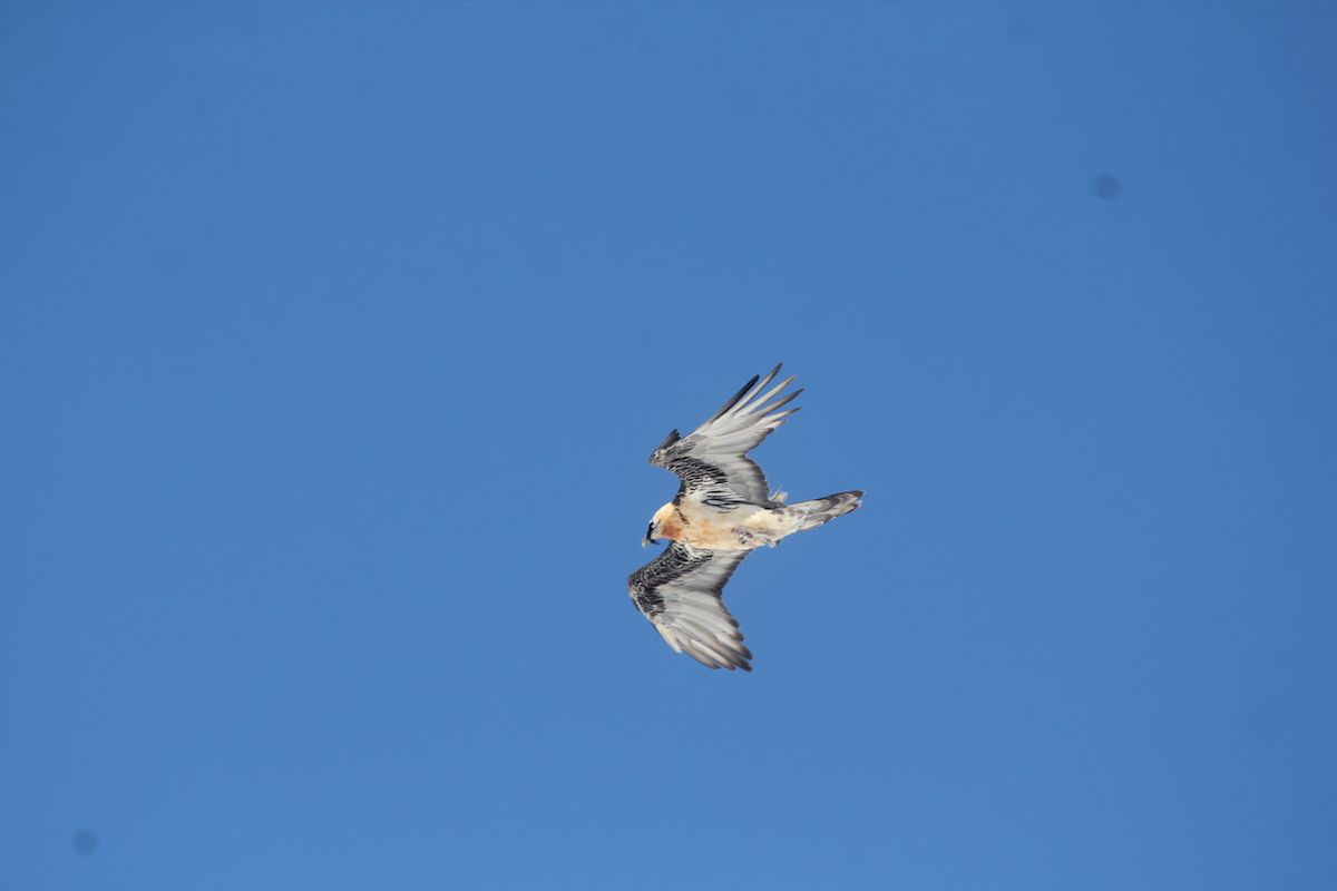 Dann dreht er in hohem Bogen und fliegt praktisch waagrecht daran vorbei. Mit einer Spannweite von bis zu 2,90 Metern handelt es sich beim Bartgeier um den grössten Alpenvogel. Nun ist er schon höher als die begeisterten Naturfotografen. Kaum zu glauben, er landet sogar weiter hinten auf einer Schneefläche. Bald fliegt er wieder davon. Mit einem Knochen in seinen Greiffüssen. Der Wirt des Bergrestaurants legt sie ihm immer mal wieder aus. Das ist denn wohl auch der Grund, warum der Bartgeier so regelmässige auf der Gemmi auftaucht. Er kontrolliert, ob nicht ein Knochen für ihn bereitliegt. Ansonsten fliegt er den Bergflanken entlang. Da ist immer mal eine Gämse abgestürzt, deren Knochen er verspeisen kann.