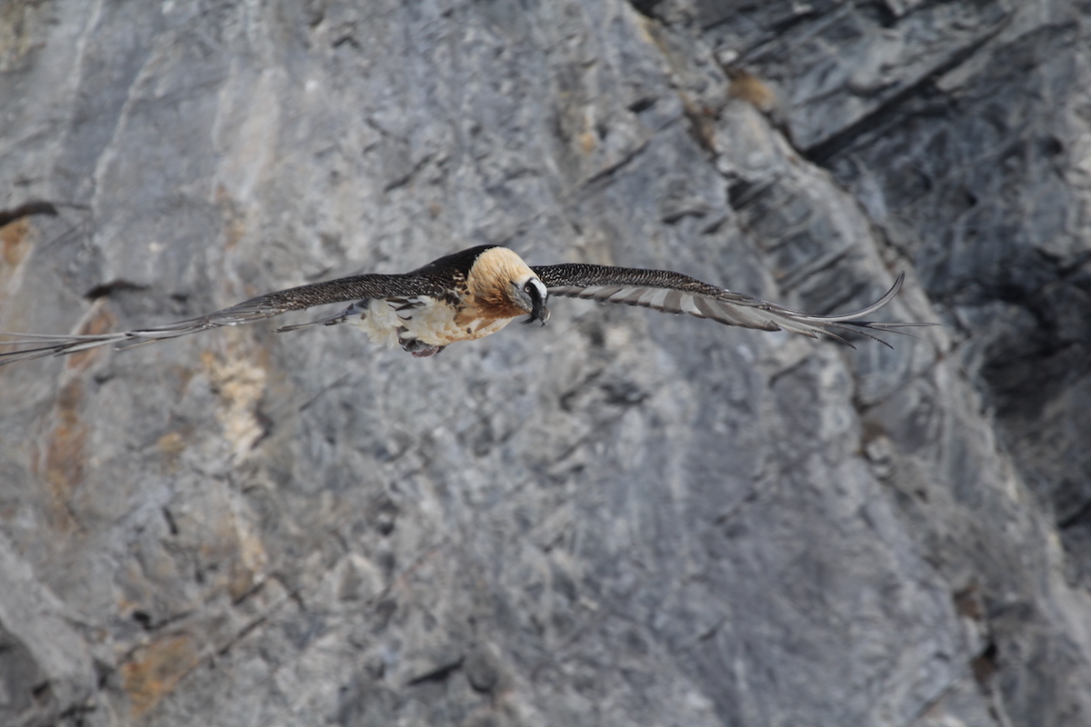Tatsächlich taucht der Riesenvogel über einem dunklen Waldflecken weit unten wie aus dem Nichts auf. Noch ist er vor allem mit dem Feldstecher zu identifizieren. Man könnte meinen, dass es nun lange dauern würde, bis er sich in die Höhe getragen hat. Doch dem ist nicht so. Er verschwindet hinter einem Felsen und ist ganz plötzlich wieder da. Er segelt immer näher, lässt sich vom starken Bergwind tragen, gleitet der Felsenflanke entlang und schiesst direkt unter der Aussichtskante durch.