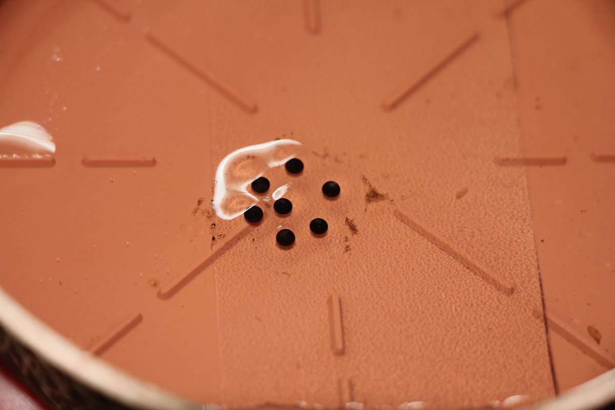 Nur drei der etwa 170 Arten von Pfeilgiftfröschen werden von Indigenen im südamerikanischen Regenwald verwendet, um Pfeilspitzen zu vergiften. «Die Giftigkeit verlieren sie in der Haltung, sie entsteht in der Natur vermutlich durch die Nahrungsaufnahme», sagt René Waldner. Er füttert seinen Fröschchen Essigfliegen in verschiedenen Grössen. Die Insekten züchtet er in Bechern, die in einer Wasserlösung stehen. «Um sie vor Milbenbefall zu schützen.» Die Essigfliegen ernährt er mit Spirulina, Hefe und Lorifutter. Sehr wichtig sind zudem Zucker, Obstessig, Banane und Haferflocken. Weiter zieht er an jungen Erbsengewächsen Erbsen- und Wickenblattläuse. Auch Springschwänze und Ofenfischchen stehen auf dem Menüplan seiner Feinschmecker.