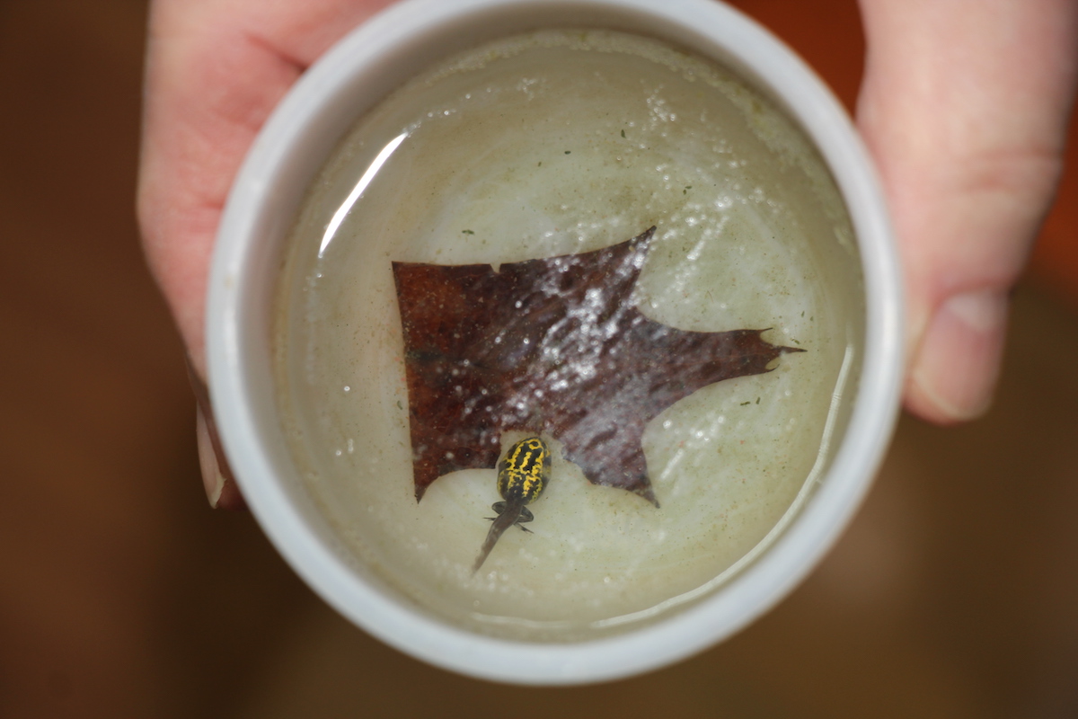 Die Zucht von Pfeilgiftfröschen ist anspruchsvoll. Ohne stete Präsenz und Hingabe gelingt sie nicht. In René Waldners Froschzimmer im ersten Stock seines Hauses schwimmen in verschiedenen weissen Bechern Eichenblätter. Darauf wabert Laich, doch nicht massenweise, wie man es von einheimischen Froschlurchen kennt, sondern lediglich drei bis fünf Eier.