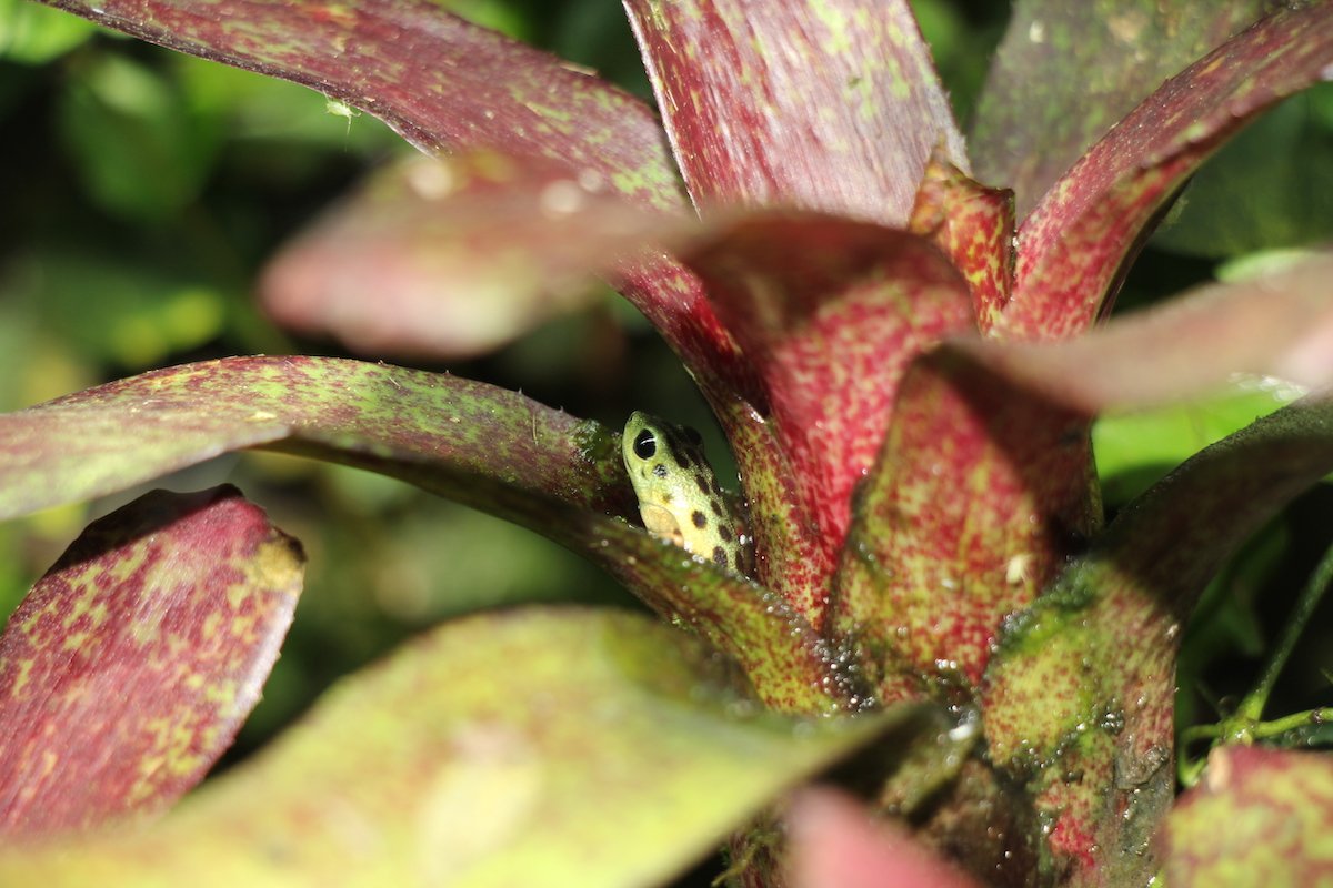 René Waldner erzählt: «Erdbeerfröschchen betreiben Brutpflege.» Sie legen vier bis sechs Eier in nasses Laub. Das Männchen bewacht sie und hält sie feucht. Nach dem Schlupf bringt das Weibchen die einzelnen Kaulquappen in verschiedene Bromelientrichter in der Baumkronenschicht. Es geht dann dort regelmässig vorbei und legt zu der Kaulquappe im Minitümpel je ein unbefruchtetes Ei.» Davon ernährt sich die Kaulquappe. «Ich finde es erstaunlich, dass das Weibchen während drei Monaten jede einzelne Bromelie mit Kaulquappen wieder findet», sagt Rene Waldner. Weil die Fröschchen bis in die Kronenschicht der Regenwaldbäume klettern, wo die Bromelien gedeihen, werden sie auch Baumsteiger genannt.