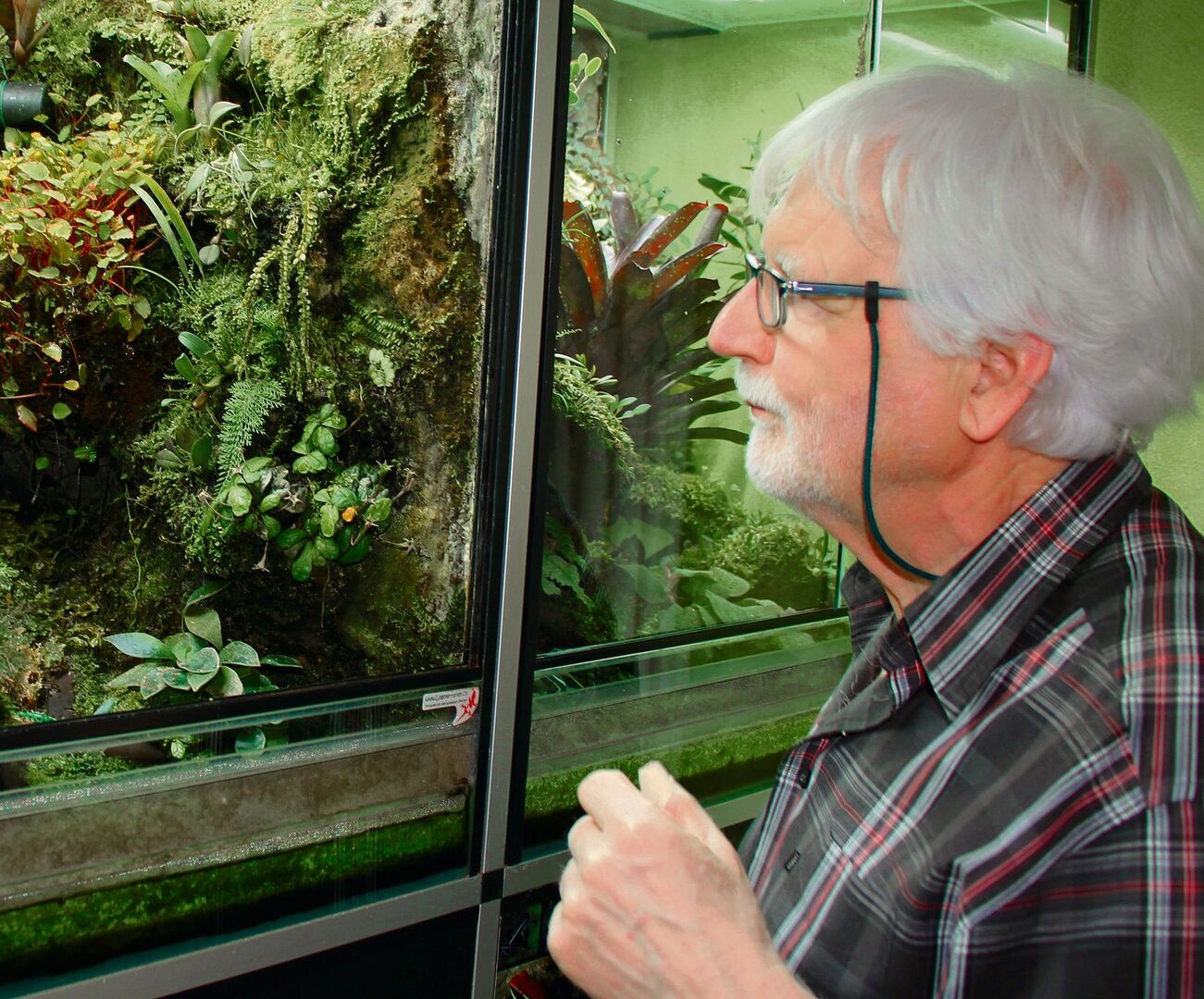 Die Szenerie spielt nicht im tropischen Südamerika, sondern in einem Haus mit Garten in Aarburg (AG). Der Tropenwald wurde von René Waldner geschaffen. «Lebensecht nachgeahmte Biotope sind mir sehr wichtig», sagt der 73-Jährige, der seit 53 Jahren von tropischen Fröschen fasziniert ist. Um ihn herum leuchtet seine Tropenwelt hinter Glas. Die Szenerien unter Kunstlicht wirken wie von südamerikanischer Sonne beschienene Abbruchkanten von Bachläufen. Oder sie gewähren einen Blick in die von Epiphyten behangene Kronenschicht des Regenwaldes. Epiphyten wie Orchideen, Farne und Bromelien sind Aufsitzerpflanzen, die sich mit ihren Wurzeln an einem Stamm festhalten, ihm aber keine Nahrung entziehen, sondern nur den Platz in luftiger Höhe nutzen, um vom Sonnenlicht zu profitieren. René Waldners Liebhaberei zu den Pfeilgiftfröschen schliesst die tropische Pflanzenwelt mit ein. Er kultiviert hauptsächlich Wildformen, die er aus Spezialgärtnereien bezieht oder unter Kollegen austauscht.