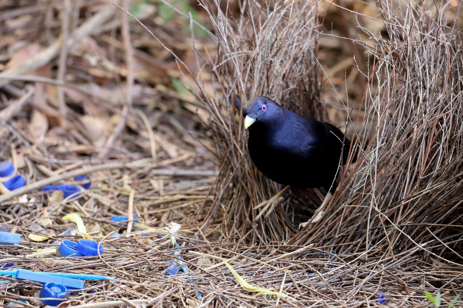 Ganz aussergewöhnlich ist das Balzverhalten des Seidenlaubvogels baut seiner Zukünftigen eine Laube. Um diese möglichst attraktiv zu machen, schmückt er sie mit Blüten, Beeren und manchmal auch Müll. Danach lockt er Anwärterinnen mit seinem Gesang. [IMG 5]