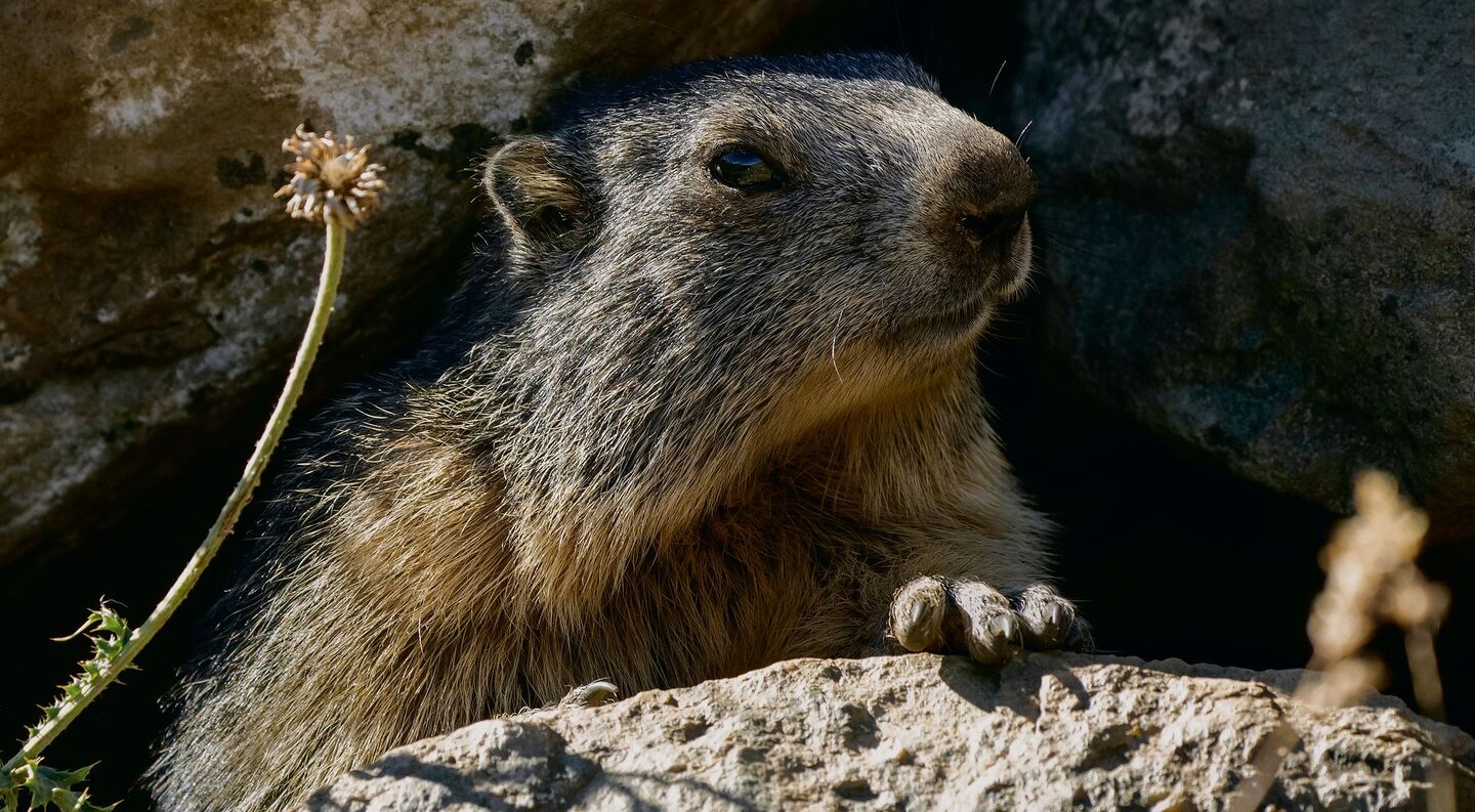 In den Wäldern der Täler sind wir von Lärchen, Rottannen, Arven und Weisskiefern um-geben. Weiter oben treffen wir zunächst auf Bergweiden, die, wie Giovanni berichtet, im Frühling von Blumen geradezu übersät sind. Noch sind keine Steinböcke zu sehen. Ab und an schaut jedoch ein dickes Murmeltier aus seinem Bau heraus. «Murmeltiere verbringen beinahe 90 Prozent ihres gesamten Lebens im Untergrund», weiss der Ranger zu berichten. «Den gesamten Winterschlaf, das sind zirka sieben Monate im Jahr, ebenso alle Nächte und dann noch die viel zu warmen Tagesstunden. Mit ihren kräftigen Vorderbeinen legen sie umfangreiche Gangsysteme und Winterbauten an, die teils mehrere Jahrhunderte lang bewohnt werden.» Und nicht nur unterirdisch tobt das Leben, auch in der Luft gibt es einiges zu sehen.