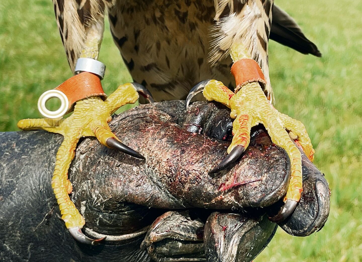 Lowingo ist etwas nervös, darum hat er eine Haube auf. Sie hilft ihm zu entspannen. Der junge Wanderfalkenterzel sitzt auf einer Stange und wartet auf seinen Einsatz. «Terzel, das sind die im Vergleich zu den Weibchen wesentlich kleineren Falkenmännchen», erklärt Norbert Wyssen. Er ist einer der wenigen Falkner der Schweiz, der Nachwuchs ausbildet.