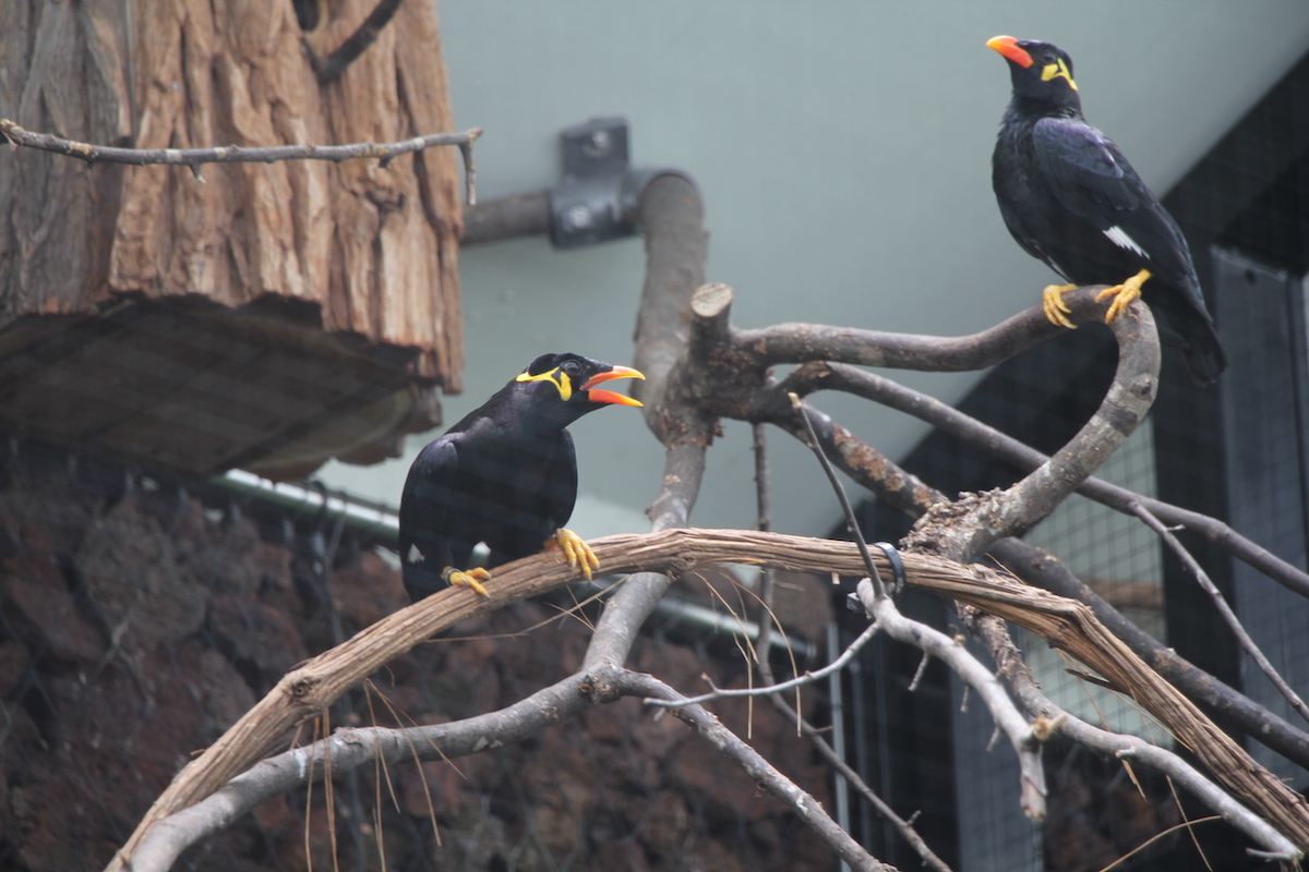 Ein melodiöser Pfiff und die Aufmerksamkeit ist ihm sicher. Der Mittelbeo flattert auf einen Ast und plustert sich auf. Er lebt zusammen mit seiner Partnerin im Vogelhaus des Zoologischen Gartens Basel. Der Beo lebt gleich in der ersten Voliere linkerhand des Eingangs. Wenn er pfeift, schauen alle nach ihm. Doch da sind auch Bettellaute aus dem Nistkasten in der linken, oberen Ecke zu hören. Sein Weibchen füttert darin eben die Jungschar.