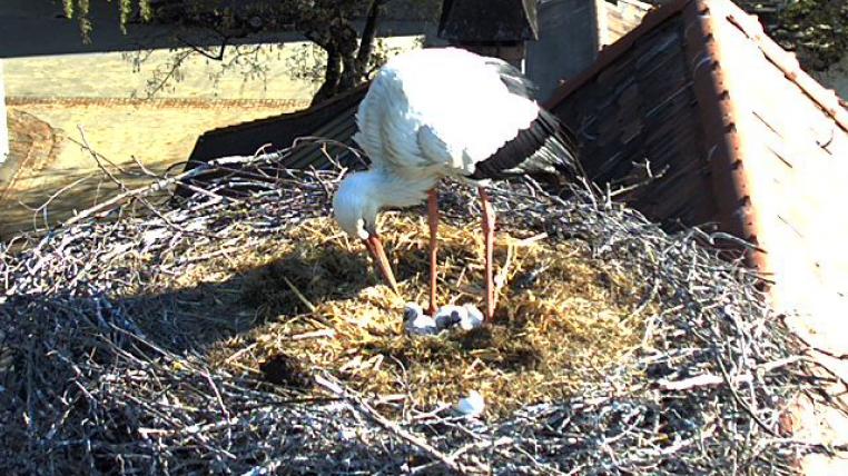 Und diese Familiengeschichte bietet einige Einblicke: Zunächst war ein Storch allein – wenige Tage später folgte ein zweites Tier. Die beiden bauten ein Nest, paarten sich und fingen an zu brüten. Und das ganz offensichtlich versiert und professionell: Trotz der winterlichen Temperaturen der vergangenen Tage schlüpften am Sonntag die ersten Küken.