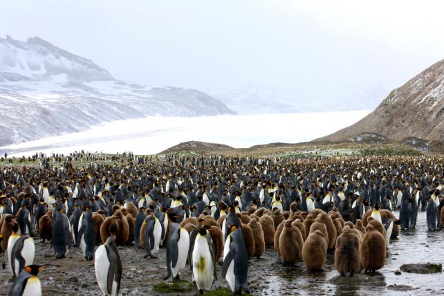 Auf Königspinguine, nach den Kaiserpinguinen die zweitgrösste Art, trifft man in der Fortuna Bay in Südgeorgien. Sie legen nur ein Ei und bauen anders als die Adélies keine Nester, sondern verwahren das Ei auf ihren Füssen. Wenn die Jungen geschlüpft sind, verwandelt sich die Bucht in ein Meer von Tausenden flauschigen braunen Jungtieren, die wie Teewärmer oder alte russische Männer in einem zu grossen Pelzmantel aussehen. Dicht an dicht gedrängt trotzen sie dem Schneetreiben. Pinguine so weit das Auge reicht. Kaum vorzustellen, dass eine Mutter hier ihr Junges allein an der Stimme wiederfinden kann.