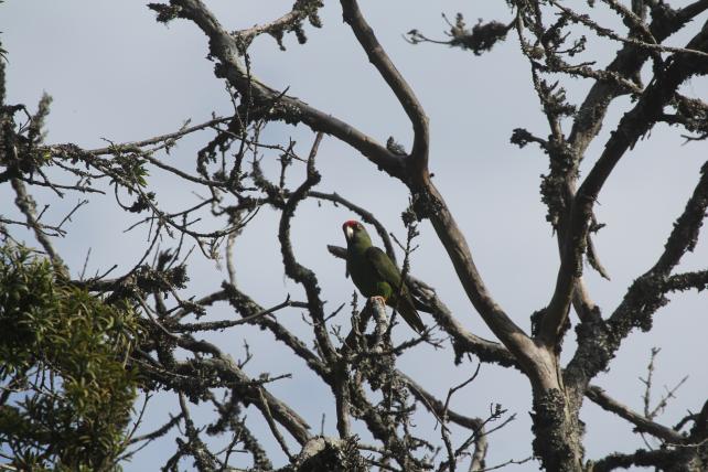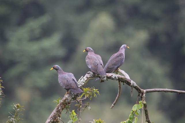 kt gebannt empor und zeigt verhalten in die Äste einer Steineibe. Jetzt sehe ich sie auch! Ein Ast wippt im leichten Wind, dahinter ziehen graue Wolken durch und geben blauen Himmel frei. Am Ast turnt ein kompakt wirkender, grüner Papagei mit oranger Stirn. Es ist ein Reichenows Kongopapagei! Er hat es auf die reifen, roten kleinen Beeren des Baumes abgesehen, die überall an den äusseren Ästen reifen. Etwa sechs Exemplare machen wir aus, die im Baum turnen, alle darauf erpicht, von den Früchten zu fressen. Einmal fliegen zwei Tiere auf einen kahlen Baum unterhalb unseres Standortes, verschwinden dann aber schnell wieder im Grün der Steineibe. Brillenvögel huschen den Ästen entlang, wohl auf der Suche nach Läusen.