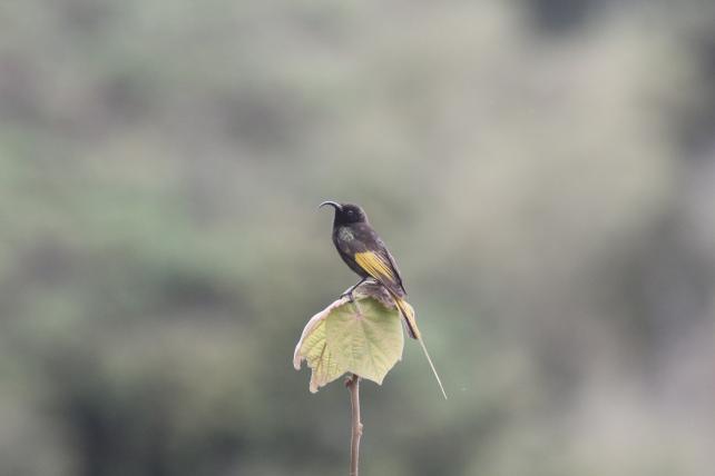 Auf einem nahen Teefeld pflücken Männer und Frauen die obersten, hellgrünen Teeblättchen. Am Rand des Feldes fliegt ein Doppelzahn-Bartvogel auf einen schräg wachsenden Bambusast. Es ist nicht der einzige Bartvogel, den ich beobachten kann. Auch der Trauerbartvogel und der schmucke Gelbschnabelbartvogel flattern plötzlich aus dem Dickicht. Ein Verbund von afrikanischen Bartvögeln! Plötzlich rauscht und braust es in der Kronenschicht des Regenwaldes. Ein Grauwangenhornvogel fliegt auf einen Ast und krallt sich gleich in luftiger Höhe an einen Baumstamm fest. Nun erkenne ich, dass der Hornvogel sein Weibchen versorgt, das in einer eingemauerten Höhle sitzt. Das Männchen schiebt das Futter durch einen kleinen Schlitz im Lehm. Während das Weibchen brütet und innerhalb ungefähr dreier Monate die Jungen aufzieht, macht es eine komplette Mauser durch.