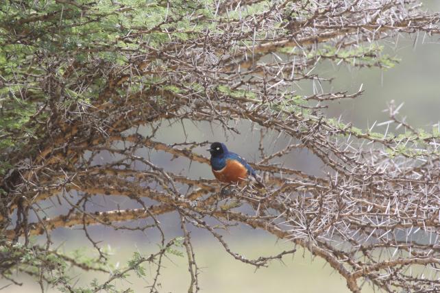 Doch auch beliebte Volierenpfleglinge tummeln sich im Nakuru-Nationalpark. So sind die Dreifarbenglanzstare immer eine Augenweide, wie sie am Boden in der Erde nesteln und mit Vorliebe gruppenweise in Akazienbüschen sitzen. Veilchenastrilde und Schmetterlingsfinken sind kleine, farbige Punkte, die am Boden nach Sämereien suchen. Die Temperatur in den Nächten im Nakuru-Nationalpark im kenianischen Rift Valley sinken zwar unter 20 °C, doch sind sie angenehm und lange nicht so kalt wie noch zu Beginn der Reise in der Hütte in den Aberdares.