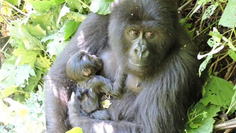 Ein Foto des Nationalparks zeigt, wie die acht Jahre alte Gorilla-Mutter Anangana ihre neugeborene Tochter im Arm hält. In einer anderen Gruppe bekam die 19-jährie Kayenga ein Baby, ein Männchen. Die Berggorillas (Gorilla beringei beringei) leben in Bergwäldern in Ruanda, Uganda und dem Osten des Kongos. Sie können bis zu 1,70 Meter gross und bis zu 260 Kilo schwer werden.