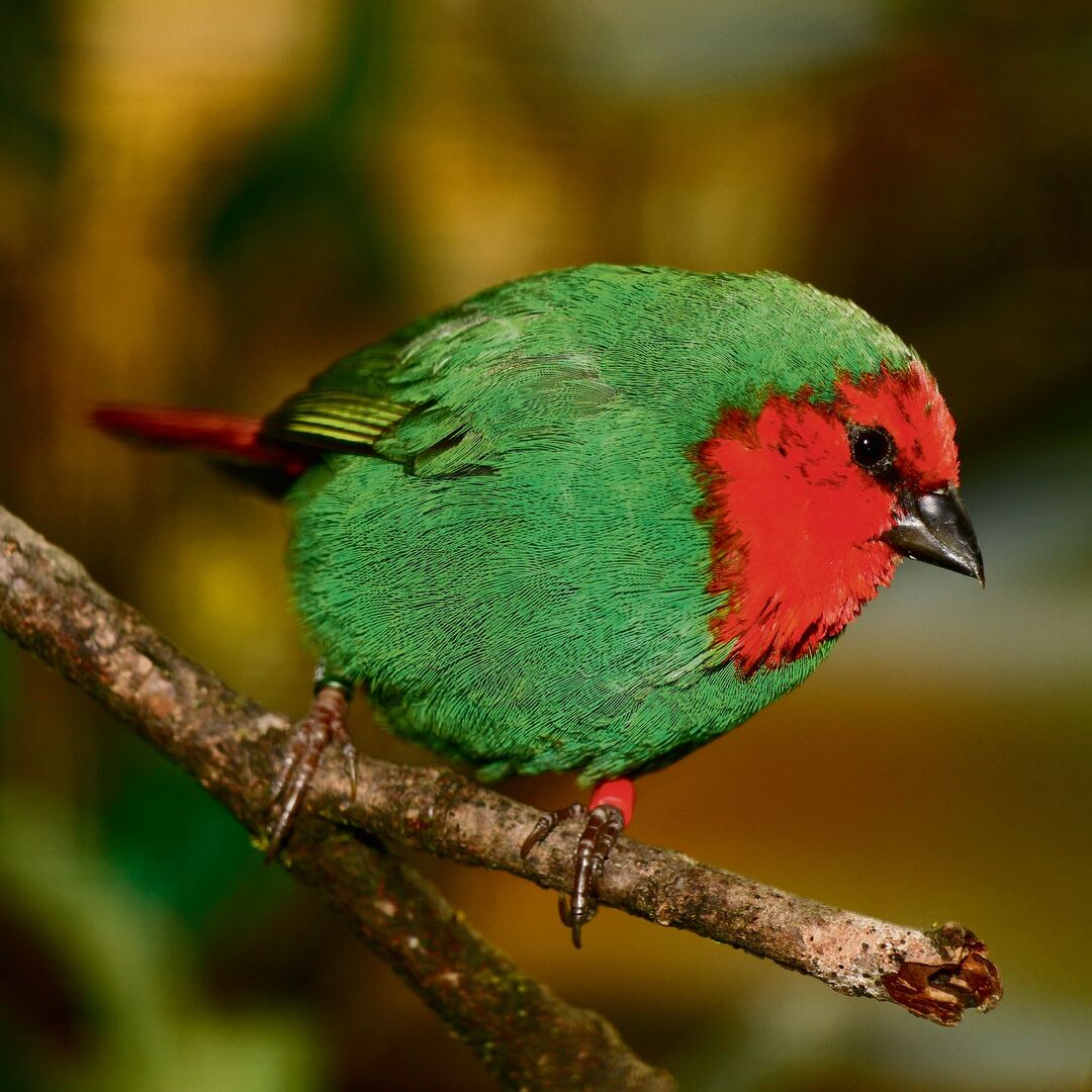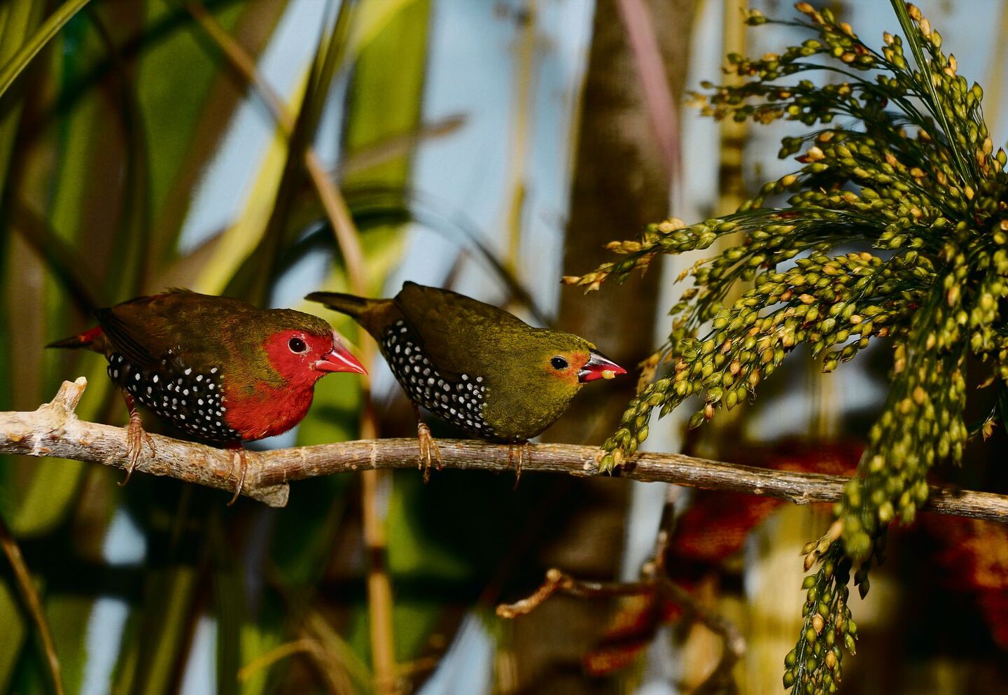 Wasser plätschert, helles Blattgrün leuchtet. Eine Rotkopf-Papageiamadine schaukelt auf einem verholzten Zweig des Wilden Weins. Sie ist eben darauf gelandet, hält das Köpfchen schief. Schon flattert sie zum Teich, hüpft ins seichte Wasser, plustert das Gefieder auf und badet.