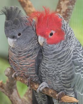 Eine grosse Rarität in den Volieren ist der Helmkakadu (Callocephalon fimbriatum). Anders als der Rosakakadu stammt er aus Wäldern im Südosten Australiens. Die verwandtschaftlichen Beziehungen dieses Sonderlings sind nicht geklärt. Auch er bildet mit Callocephalon eine monotypische Gattung. Die Art weist deutliche Geschlechtsunterschiede auf. Das Männchen hat einen roten Kopf und eine ebensolche Haube, beim Weibchen sind Kopf und Haube braun-gräulich.