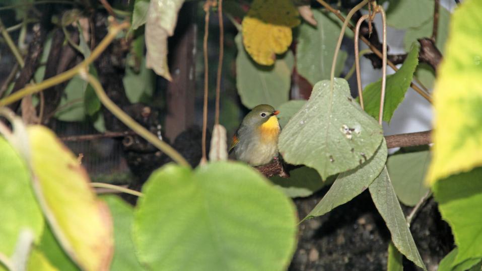 Subtropische Vegetation wuchert, ein Sonnenvogel fliegt auf einen hellgrünen, vom Regen abgewaschenen Palmwedel, derweil ein anderer mit seinem korallenroten Schnabel am Fuss des faserigen Stamms im Erdreich stochert. Ein Bachlauf plätschert durch die Anlage, die von weiteren asiatischen Arten bewohnt wird. Young sagt, dass von hier aus schon viele Sonnenvögel die Reise in andere europäische Zoos angetreten hätten. Verschiedene Paare haben sich die Voliere in unterschiedliche Reviere aufgeteilt. Das milde, vom Golfstrom geprägte Klima behagt den Chinesischen Nachtigallen sehr.