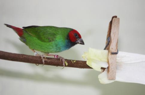 Grünfutter, gleich welcher Art, sollte man seinen Vögeln möglichst nicht einfach auf den Boden werfen. Erhöht am Volierendraht oder auf Zweigen befestigt, nehmen es die Tiere nicht nur lieber auf, sondern hier ist es auch besser gegen Verschmutzung durch Kot geschützt. Zur Befestigung verwende ich schon seit vielen Jahren handelsübliche Wäscheklammern. Bei Vogelarten, die geschickt klettern können – beispielsweise Girlitzen, Zeisigen oder verschiedenen Prachtfinkenarten – kann man aber auch die Halme zu einem Strauss zusammenbinden und so irgendwo im Geäst oder an der Decke aufhängen. Blattgrünfutter, das als Ganzes nicht so beliebt ist, darunter zum Beispiel Brennnesseln (Urtica dioica), kann man auch mit einem Messer klein schneiden, und so in einem separaten Napf oder auf einer sauberen Stelle am Boden reichen.