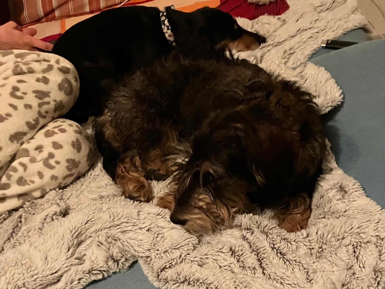 Mit dem Vertrauen, dass schon alles gut gehen würde und Frieda sich unter den anderen Hunden und Menschen bestimmt wohlfühlen wird, brachte ich sie frühmorgens in den Hort. Als ich bei meinem Reportagetermin in La Sarraz angekommen war, hatte ich auch schon die ersten Fotos und Videos vom Morgenspaziergang auf dem Natel. Es schien alles gut zu laufen. Und am Nachmittag hatte Frieda bereits eine erste Freundschaft geschlossen – mit der Dackeldame Wilma. Die beiden machten es sich dann auch zur Nachtruhe gemeinsam bequem.
