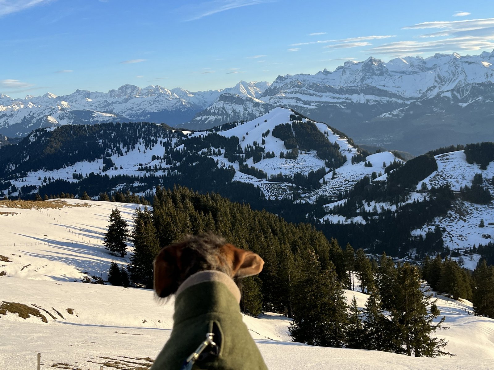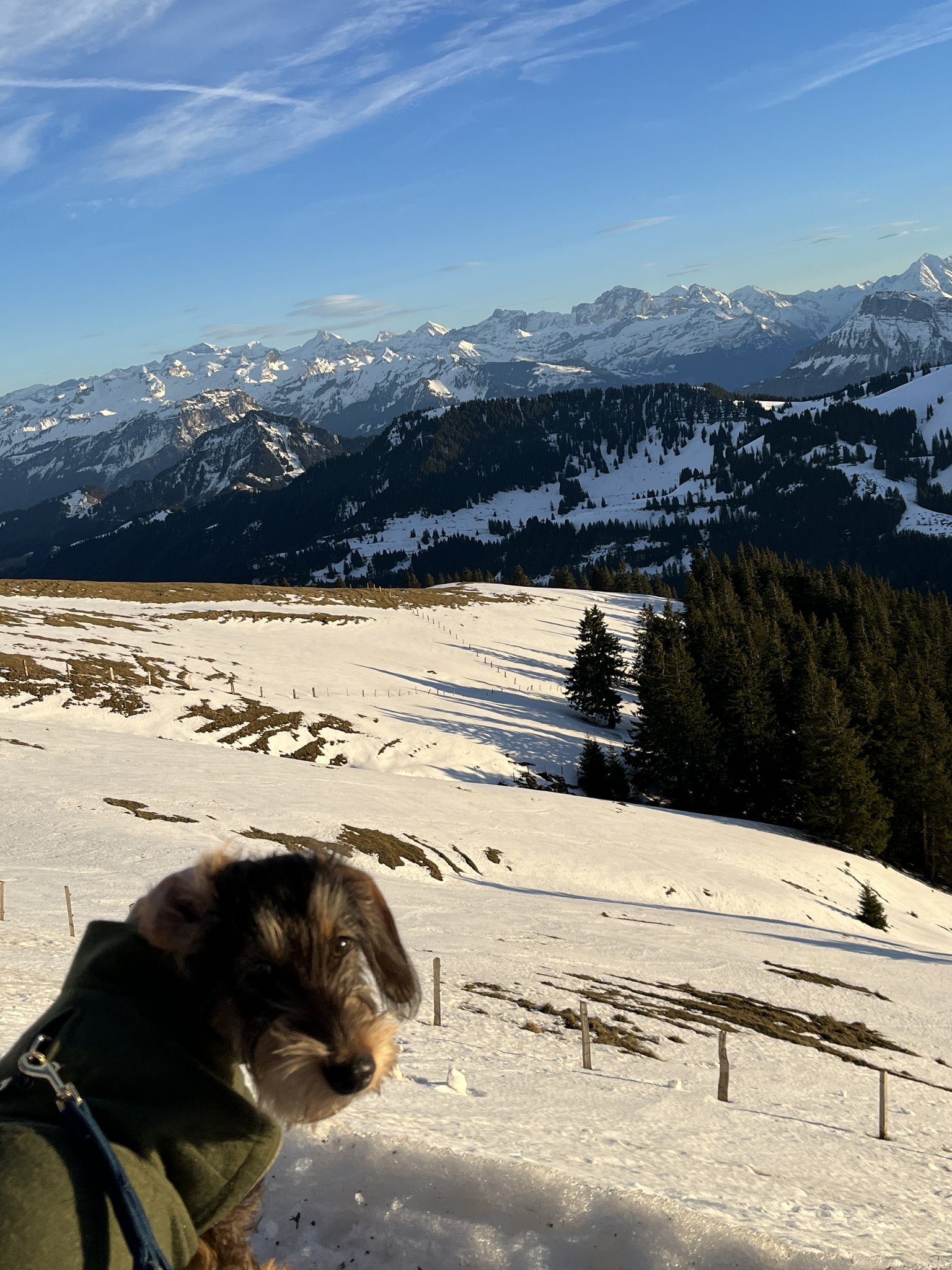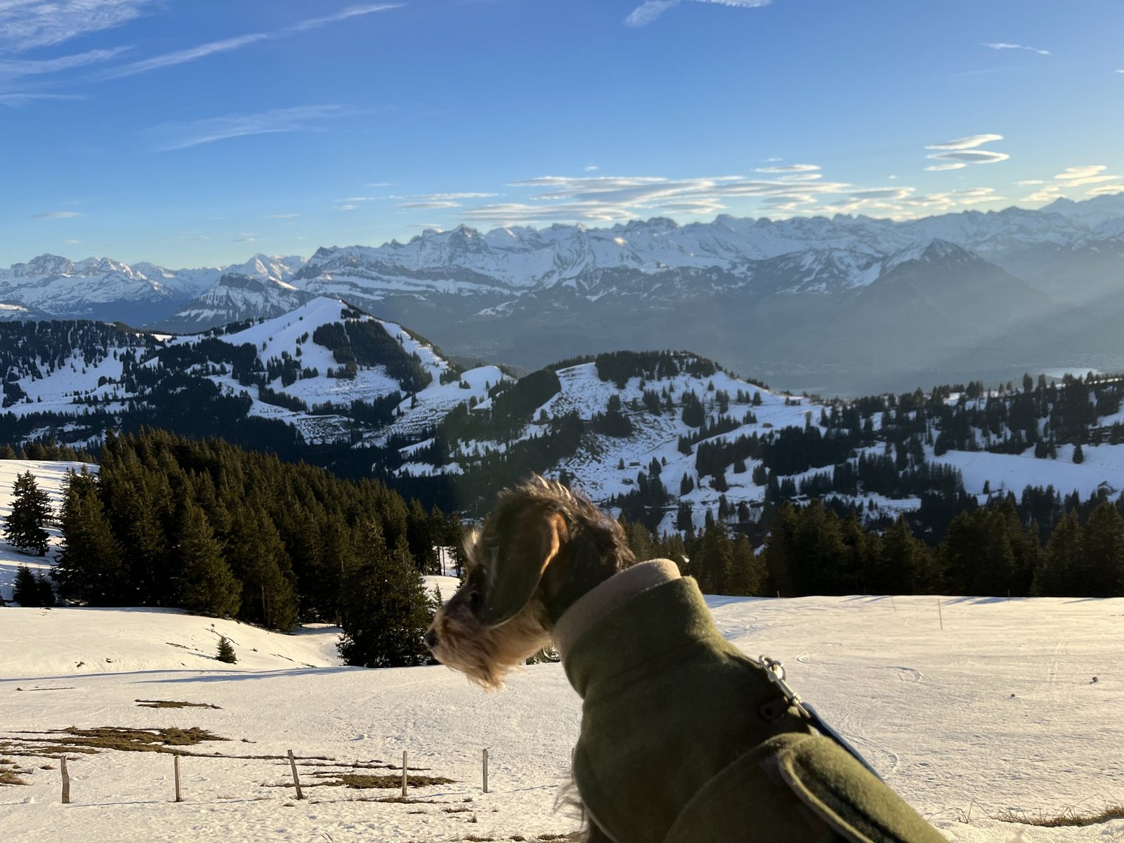 Beim Ausstieg hoch oben auf 1798 Metern über Meer wehte uns eine heftige Bise entgegen. Davon liess sich Frieda nicht beirren, denn was erblickten ihre Äuglein da: Schnee! Uns blieb kaum Zeit, die Kappe aufzusetzen und die Wanderschuhe zu schnüren, so übermütig hüpfte Frieda in alle Richtungen. Während wir mühsam durch den sulzigen Schnee stapften, rannte, schlitterte und kugelte Frieda kreuz und quer über ihre geliebte weisse Pracht. Erst als wir innehielten, um die prächtige Aussicht zu geniessen, schien auch die Dackeldame für einen kurzen Moment ihren Blick staunend auf die umliegende Bergwelt zu richten.