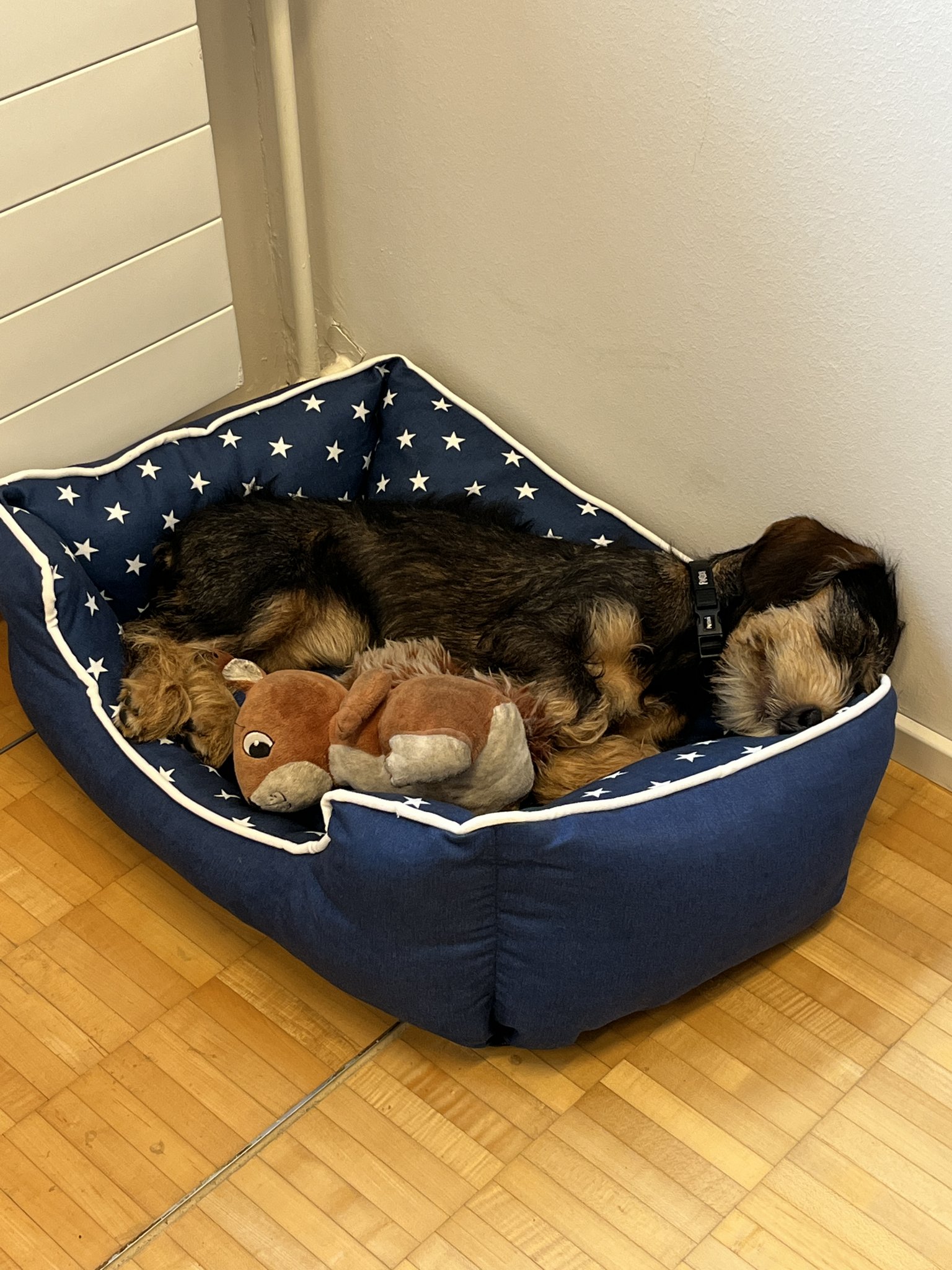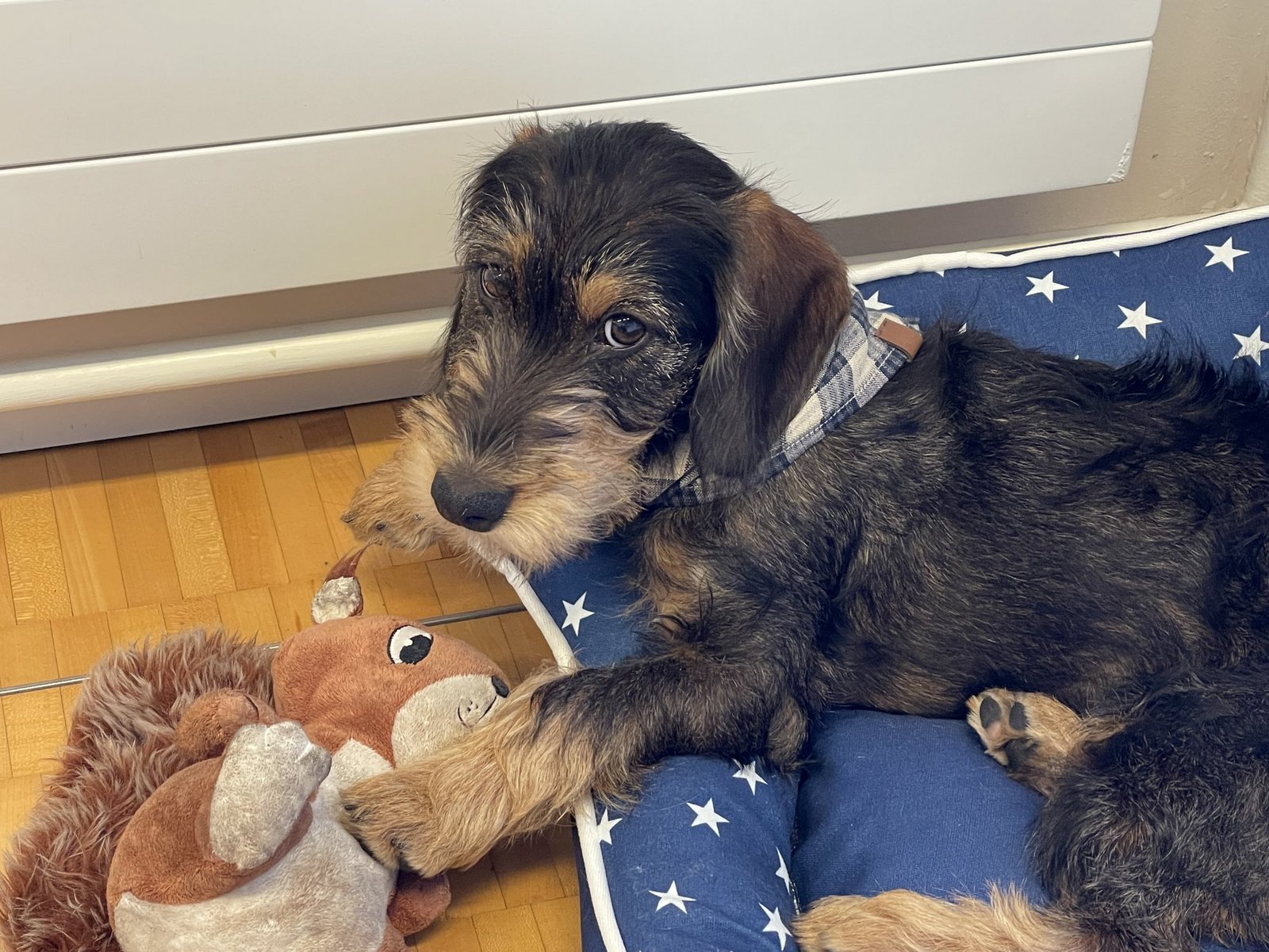 Mittags im Büro lernte Frieda dann leider noch nicht Bürohundekollegin Belka, sondern nur deren Plüscheichhörnchen kennen. Von Belkas Besitzer, Jürg Vollmer, bekam Frieda die Erlaubnis das tolle Spielzeug einen Nachmittag lange auszuleihen. Das fand die kleine Dackeldame natürlich toll. Selig verbrachte sie den Nachmittag mit Eichhörnchenkauen und Nickerchen halten. Und ab und zu setzte sich Frieda vor die Glasscheibe unseres Büros, um die vorbeigehenden Leute zu betrachten. Mit diesem entspannten Verhalten und natürlich auch dank ihres grossen Charmes vermochte Frieda schon an ihrem ersten Arbeitstag meine TierWelt-Bürogspändli, Lars Lepperhof und Gülpinar Günes für sich einzunehmen. Doch wie wird Belka reagieren, wenn Frieda am nächsten Bürotag wieder das Eichhörnchen stibitzen will?
