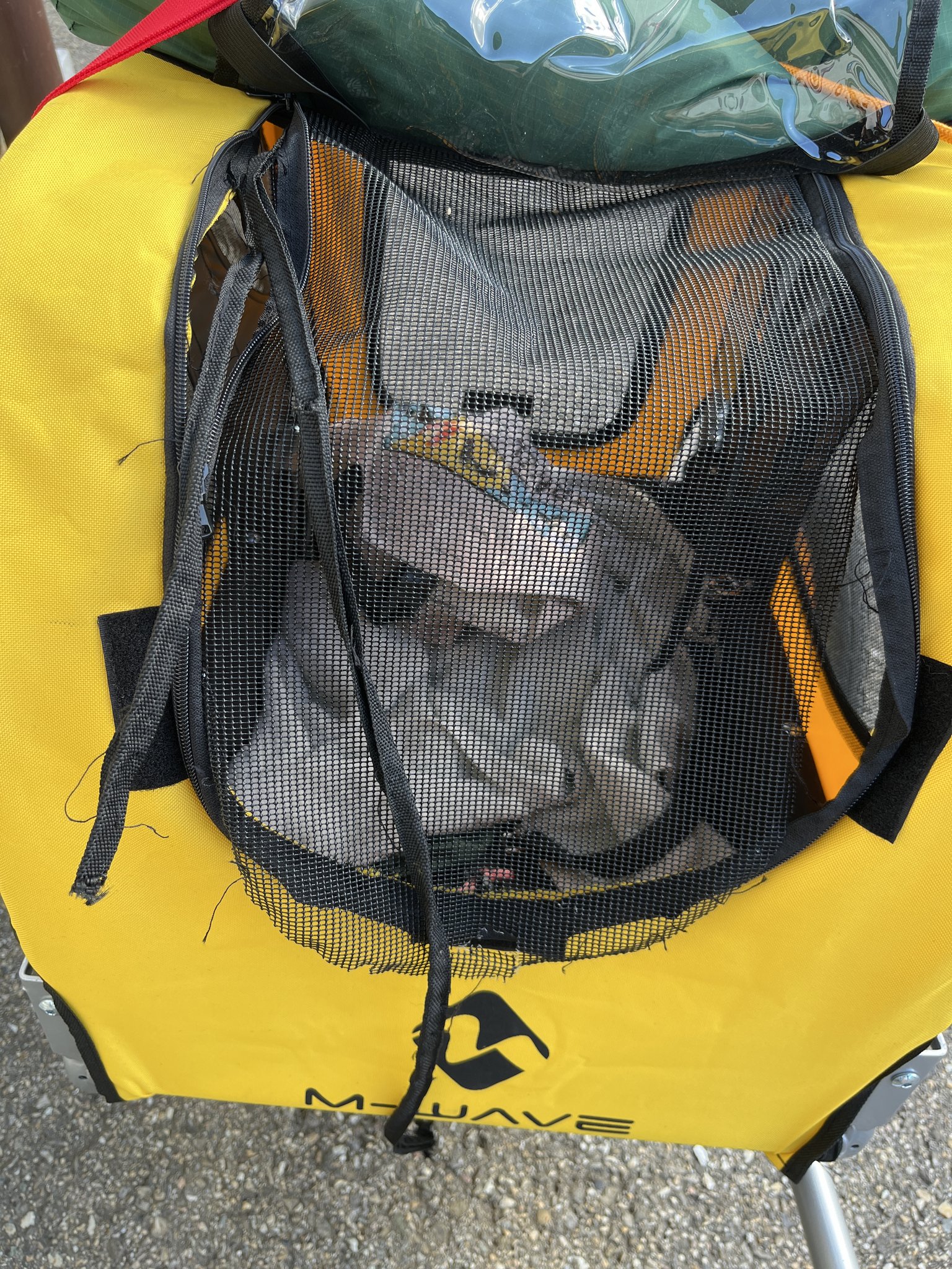 Nach jedem Halt und jeder Etappe, die Frieda ausserhalb des Anhängers verbringen durfte, fand sie es eine grössere Zumutung wieder in das Gefährt zu steigen. Als wir am Nachmittag in Les Bois Kaffeepause machten, bemerkte ich ein kleines Loch im Netz des Fensters. Und als wir dann von Les Bois losfuhren, ging es nicht lange und Frieda hatte aus dem kleinen Loch einen riesigen Schranz gerissen.