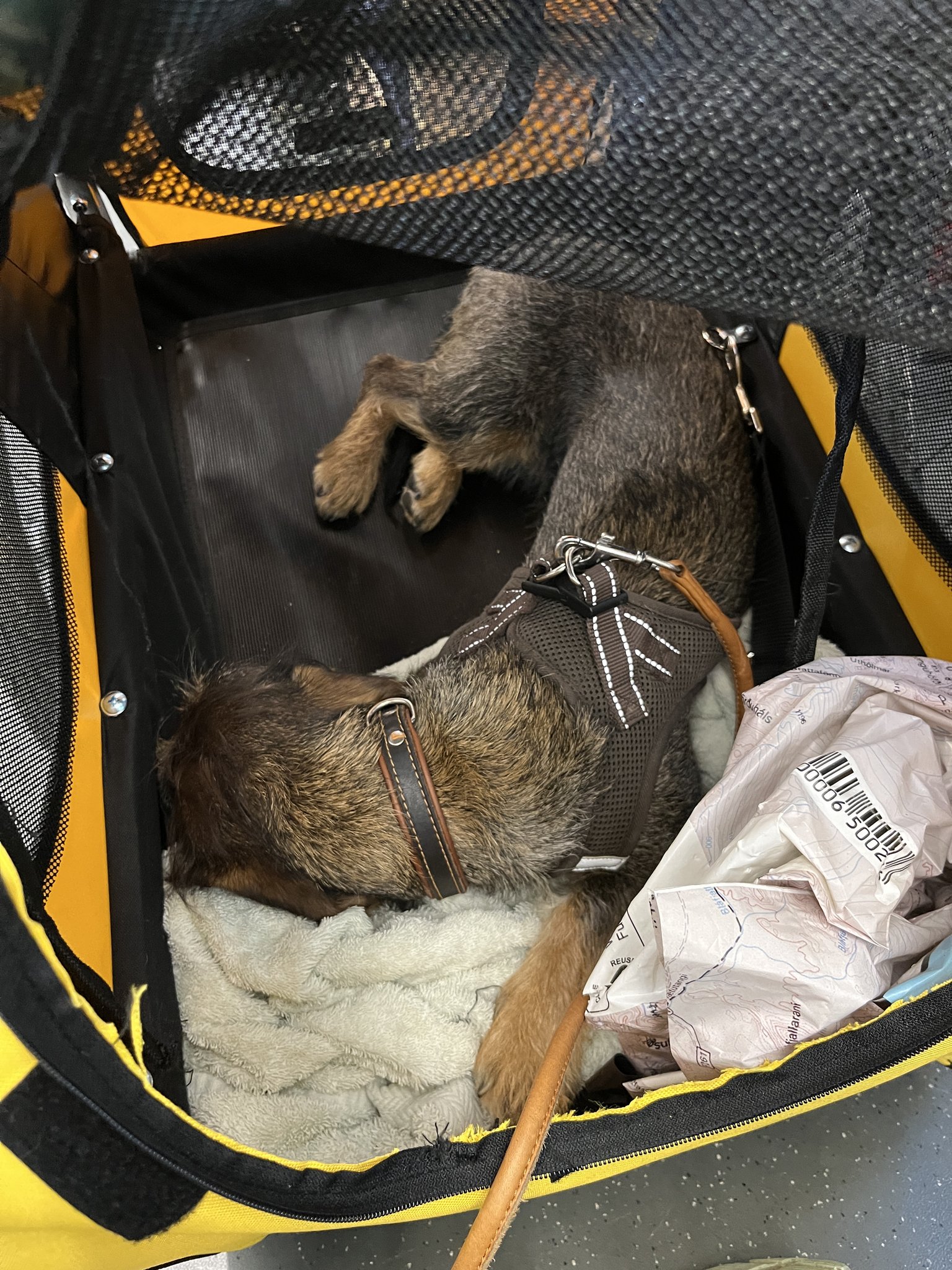 Immerhin, auf dem Heimweg im Zug wollte die Dackeldame dann unbedingt im Anhänger liegen, auch wenn dieser völlig schief und unbequem dastand……