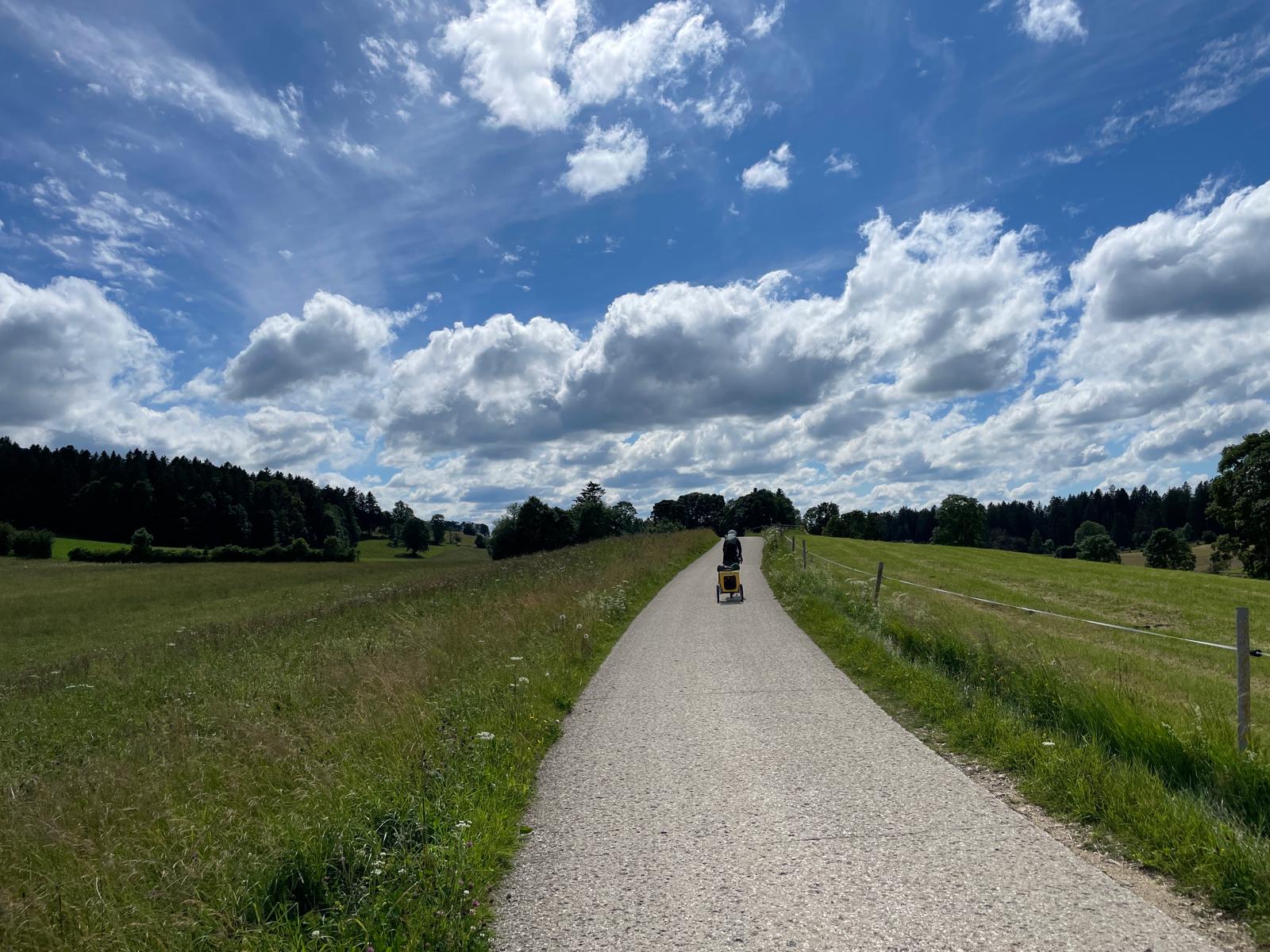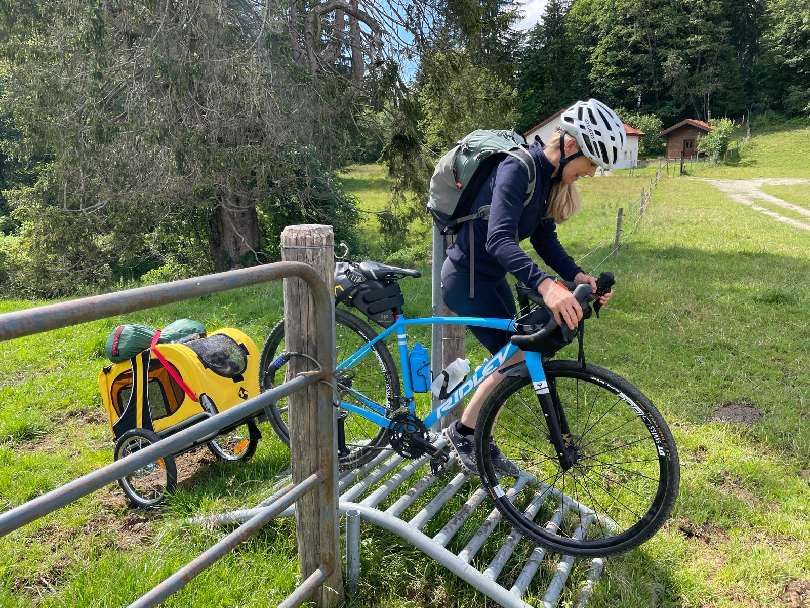 Als wir mit den Velos losfuhren, zeigte sich Frieda noch einigermassen zufrieden. Beim ersten längeren Anstieg liess ich sie dann aussteigen und neben dem Velo herrennen, was ihr super gut gefiel. Etwas weniger lustig fand sie es danach wieder in den Hänger zu steigen. «Was soll ich mich in dieser Box herumkutschieren lassen, wenn ich über wunderschöne Wiesen rennen könnte!», wird sich die Kleine gedacht haben. Ihren Unmut tat sie mit Gebell und Gerupfe im Anhänger kund. Auch meine Nerven wurden zunehmend dünner. Die schöne Landschaft geniessen – Fehlanzeige.